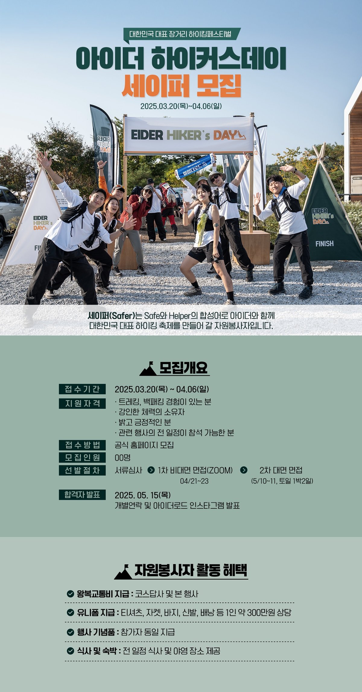 아웃도어 브랜드 아이더가 대한민국 대표 장거리 하이킹 페스티벌 ‘하이커스데이’의 성공적인 운영을 위해 자원봉사자 ‘세이퍼(Safe+Helper)’를 모집한다.영덕 블루로드에서 펼쳐지는 3박 4일간의 특별한 도전