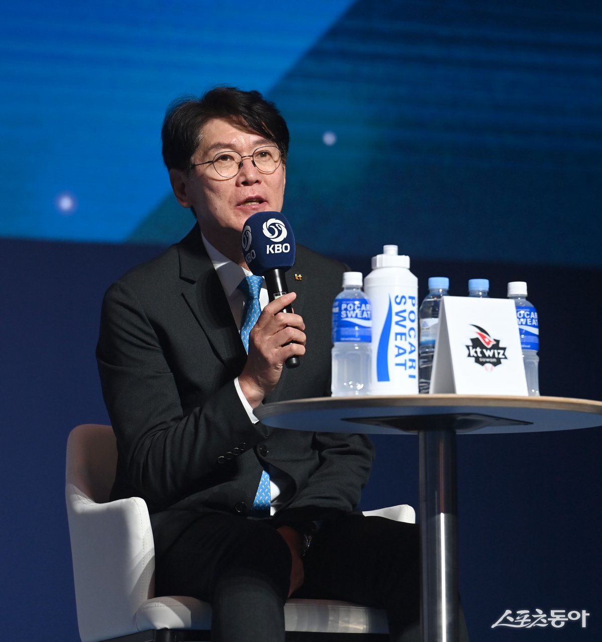 20일 서울 송파구 롯데호텔 월드에서 열린 2025 신한 SOL Bank KBO 미디어데이에서 KT 이강철 감독이 쥐재진의 질문에 대답하고 있다. 김종원 기자 won@donga.com