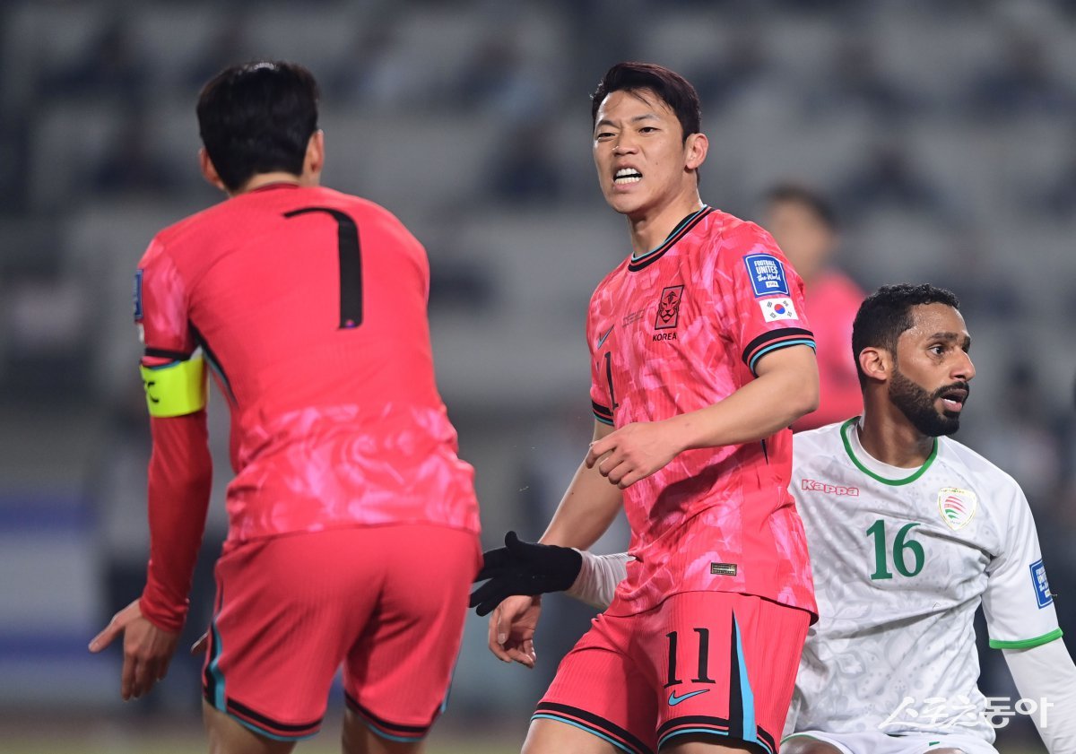 20일 고양종합운동장에서 열린 2026 국제축구연맹 북중미 월드컵 아시아 지역 3차예선 7차전 한국과 오만의 경기에서 골 찬스를 놓친 한국 황희찬이 아쉬워하고 있다. 고양 | 주현희 기자 teth1147@donga.com