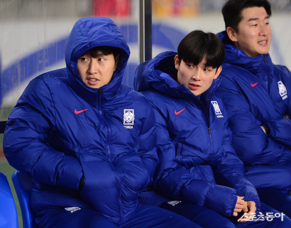 20일 고양종합운동장에서 열린 2026 국제축구연맹 북중미 월드컵 아시아 지역 3차예선 7차전 한국과 오만의 경기에 앞서 한국 이강인, 양민혁이 이야기를 하고 있다. 고양 | 주현희 기자 teth1147@donga.com