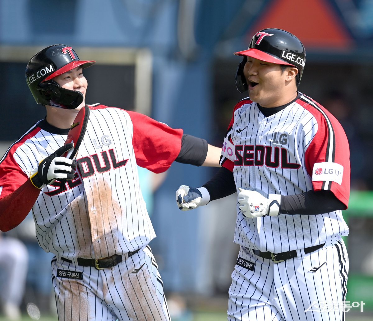 23일 서울 잠실야구장에서 ‘2025 신한은행 SOL뱅크 KBO리그’ 롯데 자이언츠와 LG 트윈스 경기가 열렸다. 1회말 2사 2루 LG 문보경이 우월 투런 홈런을 날리고 그라운드를 돌아 홈인해 기뻐하고 있다. 잠실|김종원 기자 won@donga.com