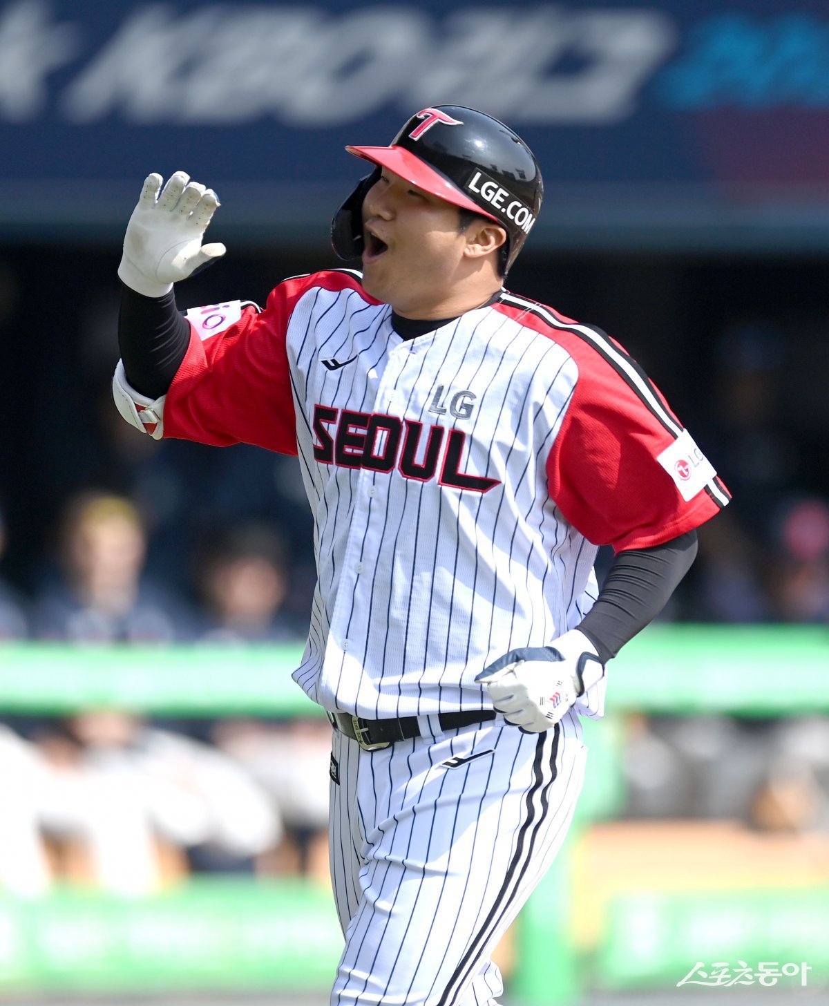 23일 서울 잠실야구장에서 ‘2025 신한은행 SOL뱅크 KBO리그’ 롯데 자이언츠와 LG 트윈스 경기가 열렸다. 1회말 2사 2루 LG 문보경이 우월 투런 홈런을 날리고 그라운드를 돌아 홈인해 기뻐하고 있다. 잠실|김종원 기자 won@donga.com