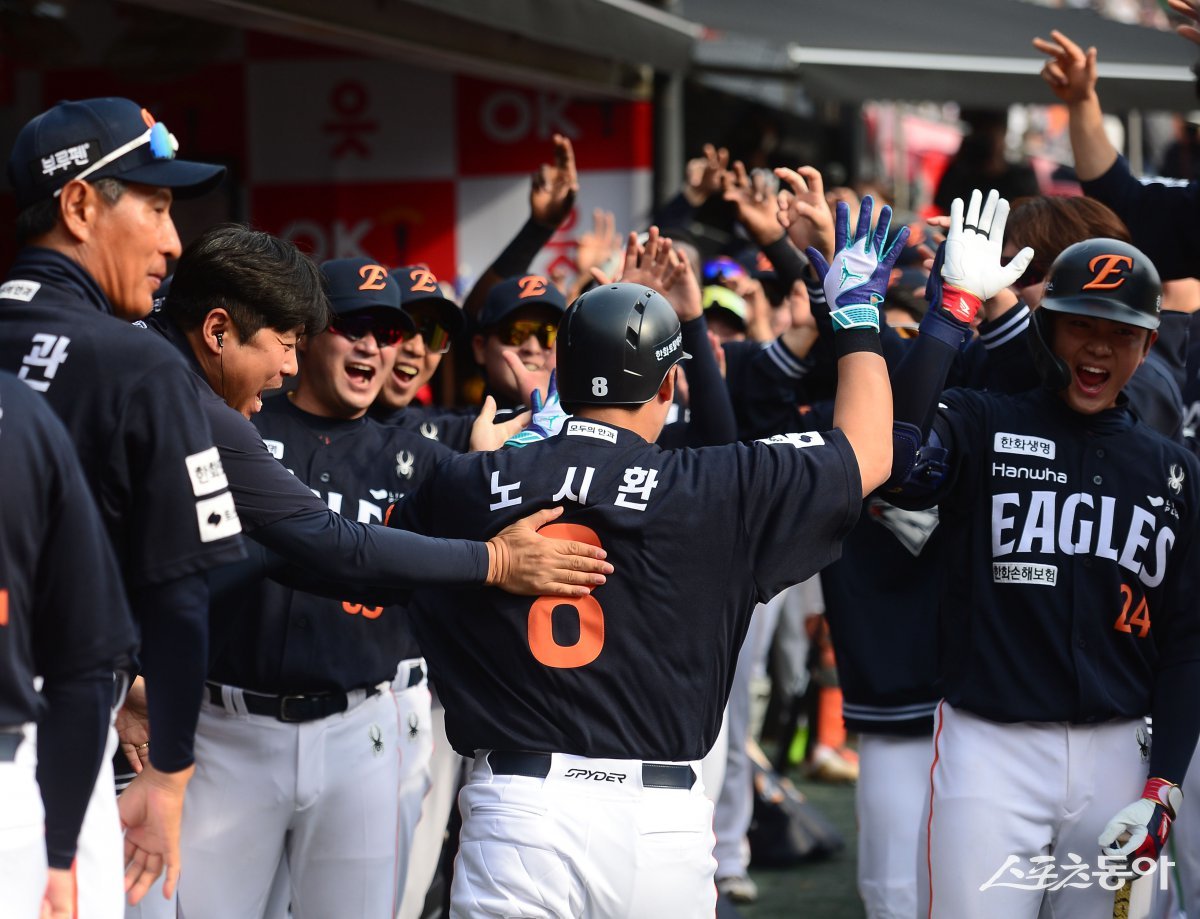 23일 수원KT위즈파크에서 열린 ‘2025 신한 SOL Bank KBO리그’ 한화 이글스와 KT 위즈의 경기에서 9회초 무사 한화 노시환이 동점 솔로 홈런을 친 후 더그아웃에서 동료들에 축하를 받고 있다. 수원 | 주현희 기자 teth1147@donga.com