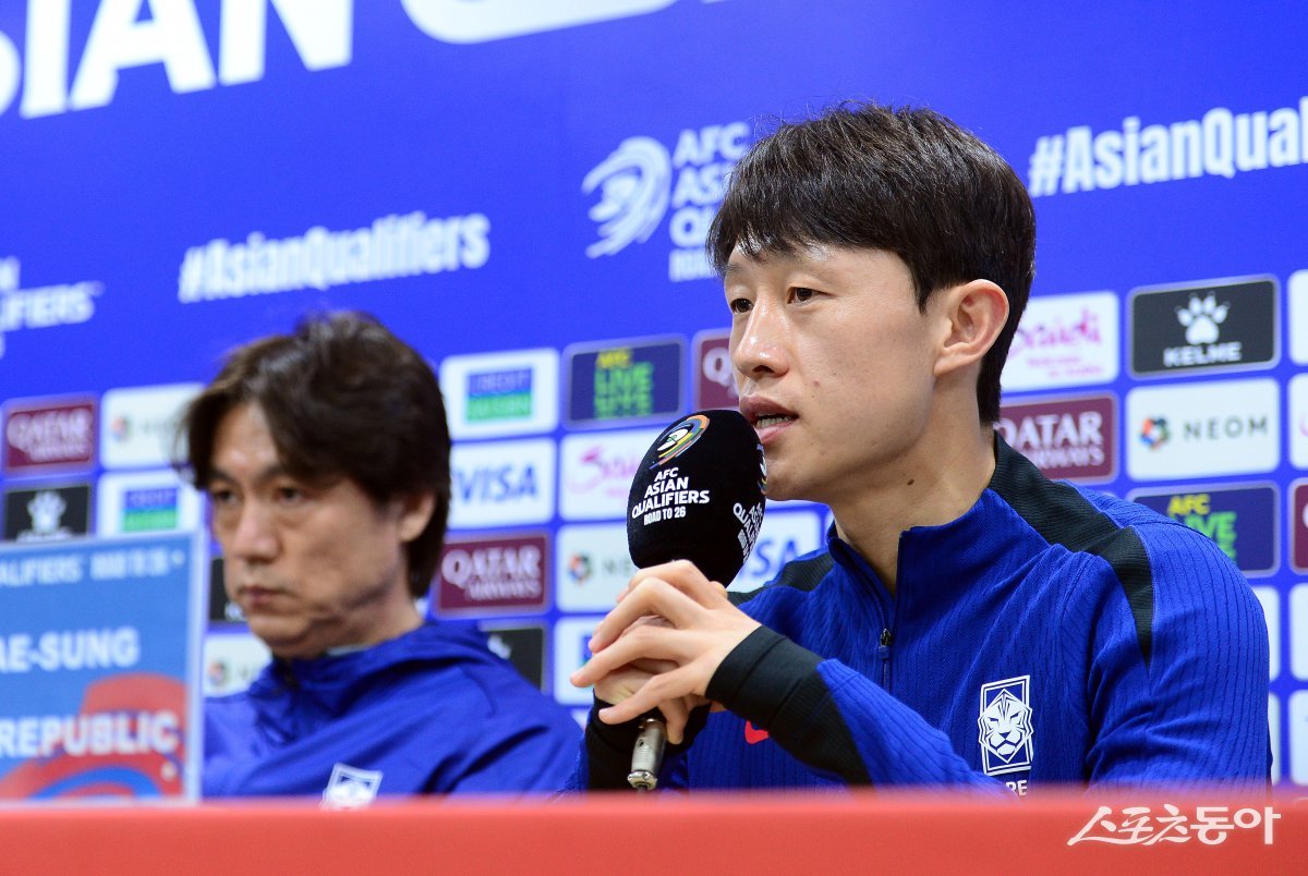 2026 북중미 월드컵 아시아 3차 예선을 앞둔 한국 축구국가대표팀이 24일 수원월드컵경기장에서 공식 기자회견을 가졌다. 이재성이 취재진의 질문에 대답하고 있다. 수원|김종원 기자 won@donga.com