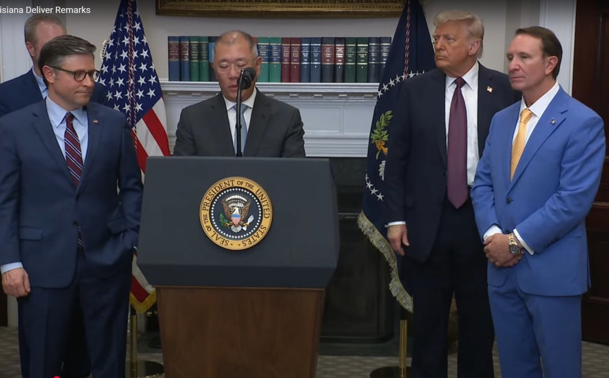 정의선(왼쪽에서 두 번쨔) 현대차그룹 회장이 24일(현지시간) 미국 워싱턴 백악관에서 도널드 트럼프(오른쪽에서 두 번째) 대통령이 지켜보는 가운데 2028년까지 210억달러를 미국에 투자하겠다고 발표하고 있다. 출처 |백악관 유뷰브 캡춰.