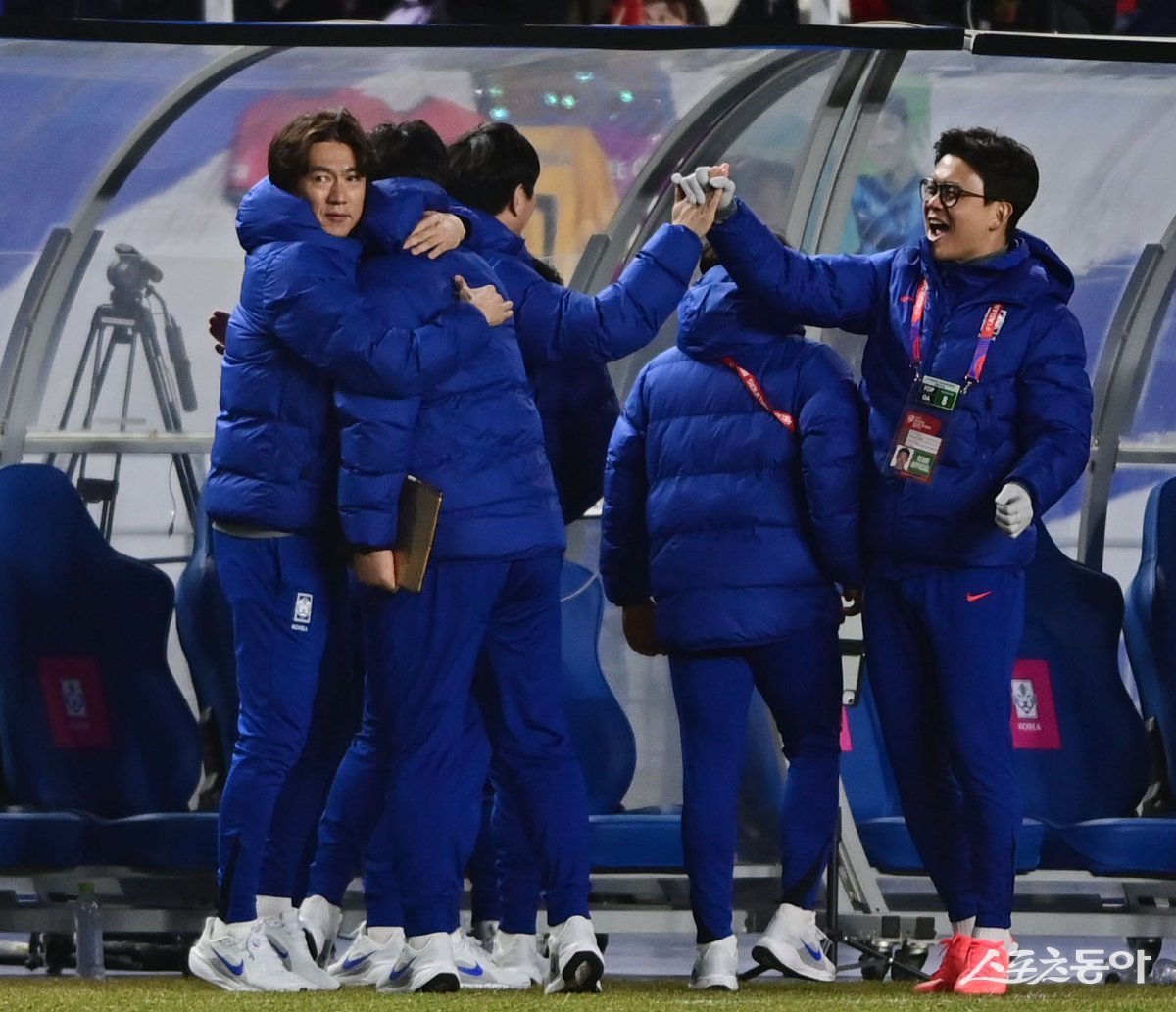 25일 수원월드컵경기장에서 열린 2026 국제축구연맹 북중미 월드컵 아시아 지역 3차 예선 한국과 요르단의 경기에서 한국 이재성의 선제골 때 홍명보 감독이 코치들과 기쁨을 나누고 있다. 수원 | 주현희 기자 teth1147@donga.com