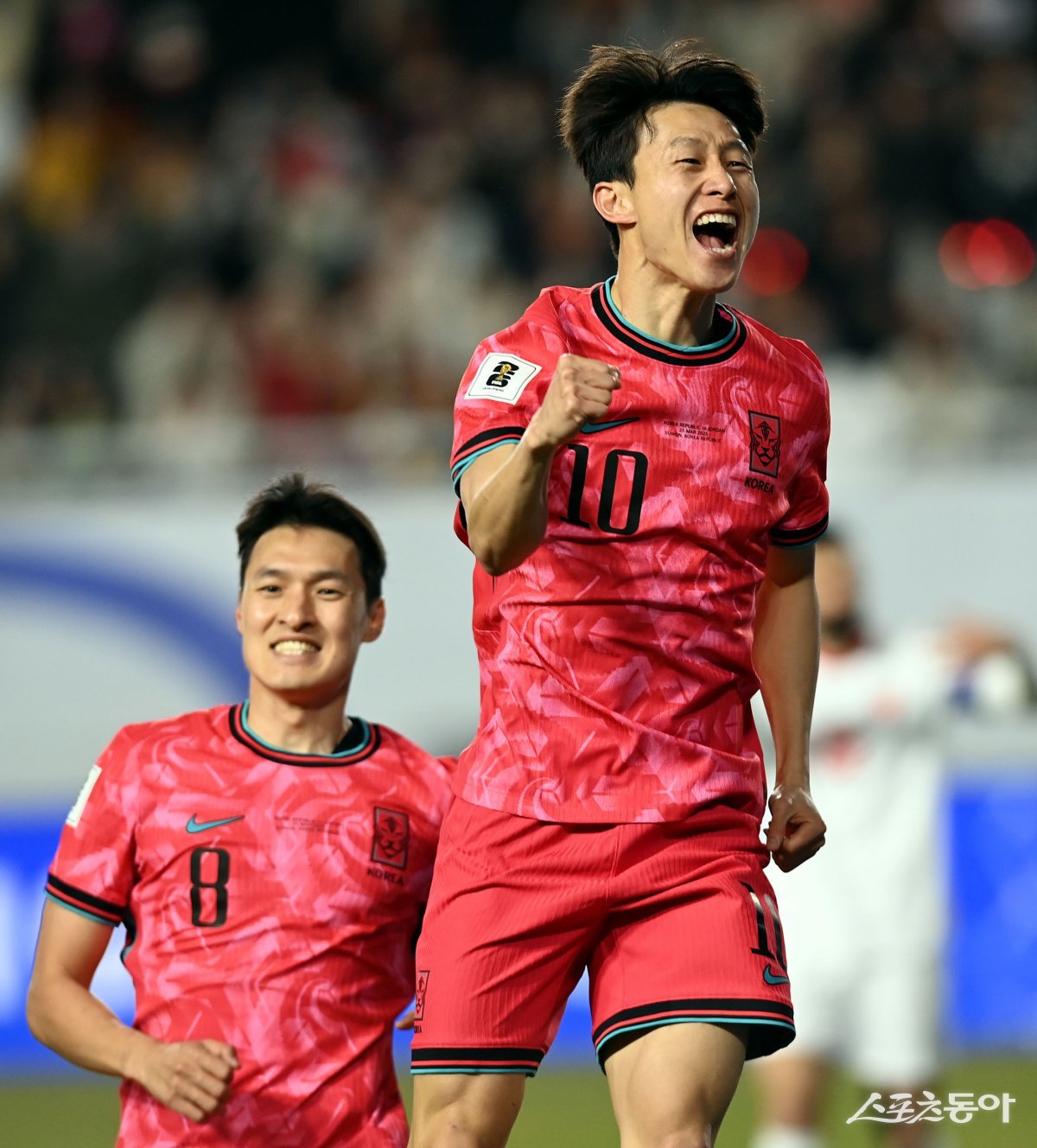 25일 경기도 수원 월드컵경기장에서 ‘2026 북중미 월드컵’ 아시아 3차예선 한국과 요르단의 경기에서 한국 이재성이 선제골을 넣은 후 환호하고 있다. 수원 | 김민성 기자 marineboy@donga.com