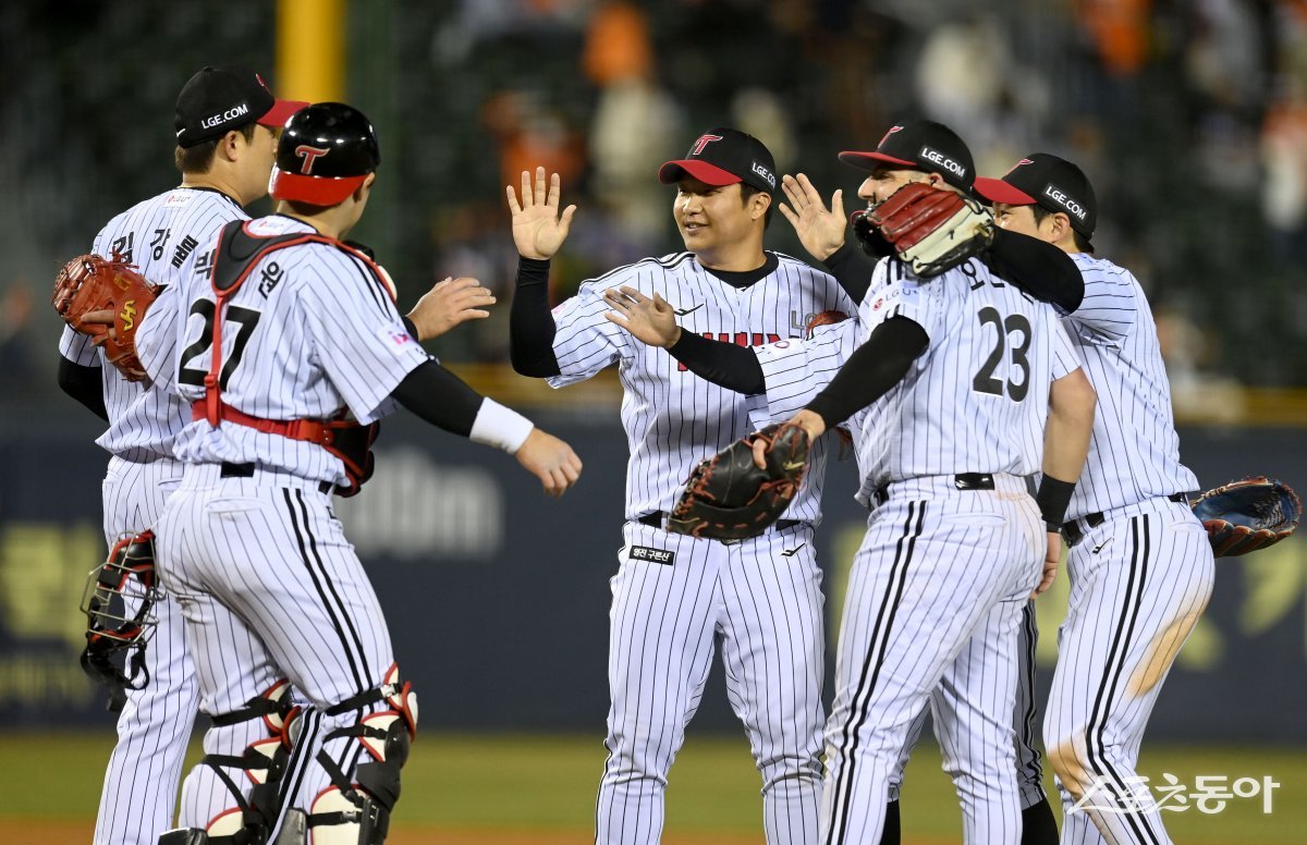 25일 서울 잠실야구장에서 ‘2025 신한은행 SOL뱅크 KBO리그’ 한화 이글스와 LG 트윈스 경기가 열렸다. 5-0 승리를 거두며 개막 3연승을 달린 LG 선수들이 하이파이브 하고 있다. 잠실|김종원 기자 won@donga.com