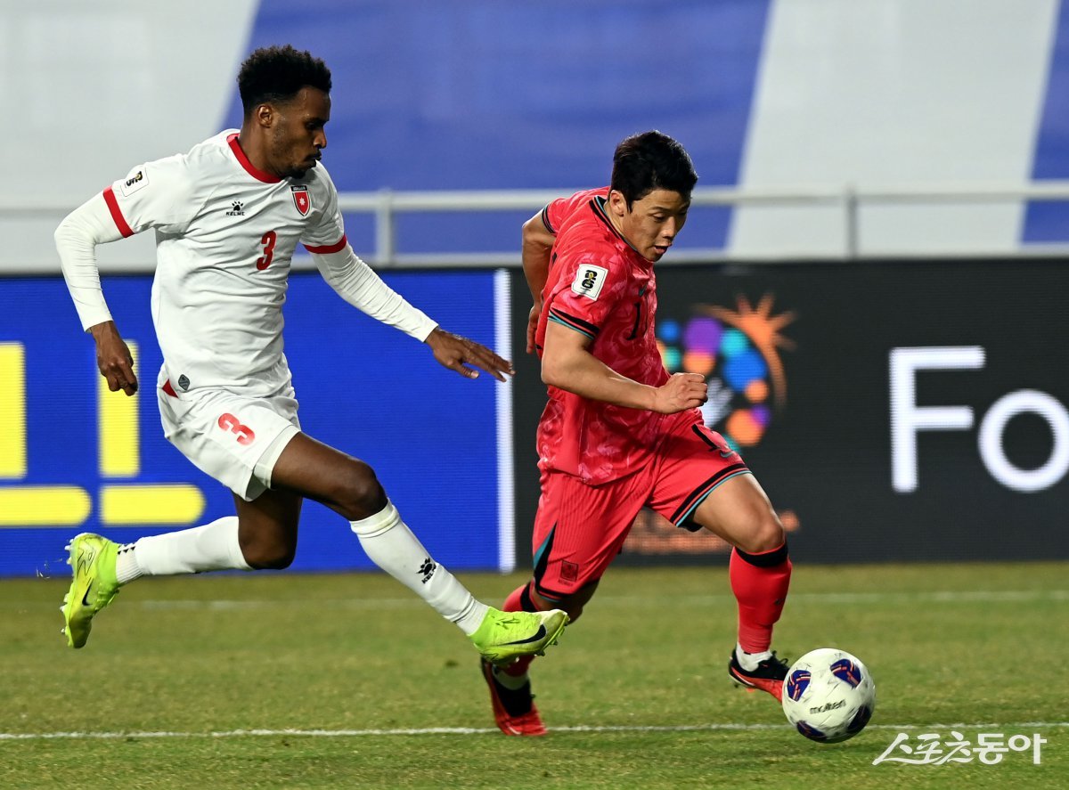 25일 경기도 수원 월드컵경기장에서 ‘2026 북중미 월드컵’ 아시아 3차예선 한국과 요르단의 경기에서 한국 황희찬이 요르단 수비를 피해 돌파하고 있다. 수원 | 김민성 기자 marineboy@donga.com