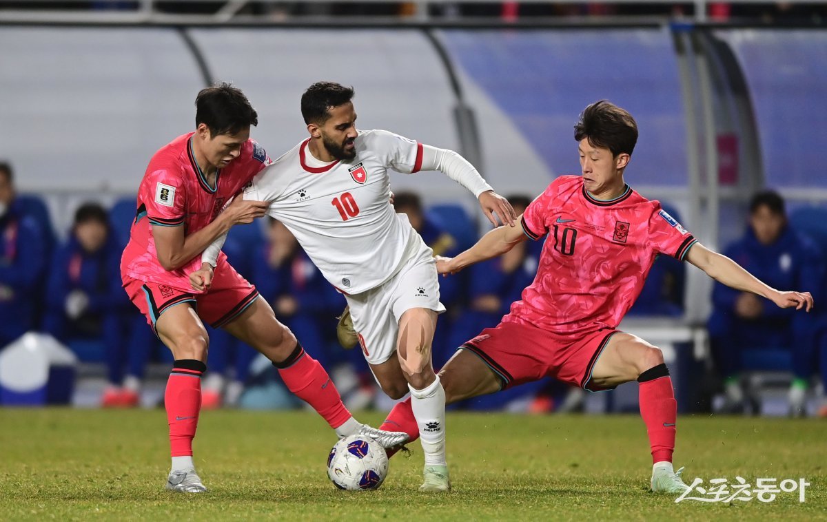25일 수원월드컵경기장에서 열린 2026 국제축구연맹 북중미 월드컵 아시아 지역 3차 예선 한국과 요르단의 경기에서 한국 박용우, 이재성이 요르단의 볼을 빼앗고 있다. 수원 | 주현희 기자 teth1147@donga.com