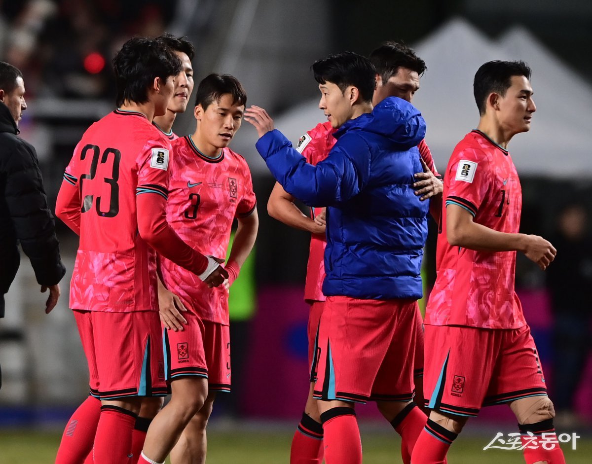 25일 수원월드컵경기장에서 열린 2026 국제축구연맹 북중미 월드컵 아시아 지역 3차 예선 한국과 요르단의 경기에서 1-1 무승부를 거둔 한국 손흥민이 동료들을 격려하고 있다. 수원 | 주현희 기자 teth1147@donga.com