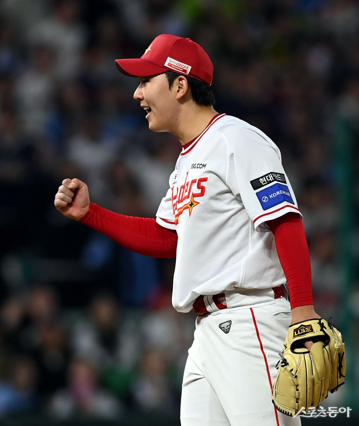 26일 인천 SSG 랜더스필드에서 ‘2025 신한 SOL 뱅크 KBO리그’ SSG 랜더스와 롯데 자이언츠의 경기가 열렸다. 5회초 1사 1, 2루에서 SSG 선발 송영진이 삼진을 잡은 후 주먹을 쥐며 환호하고 있다. 인천 | 김민성 기자 marineboy@donga.com