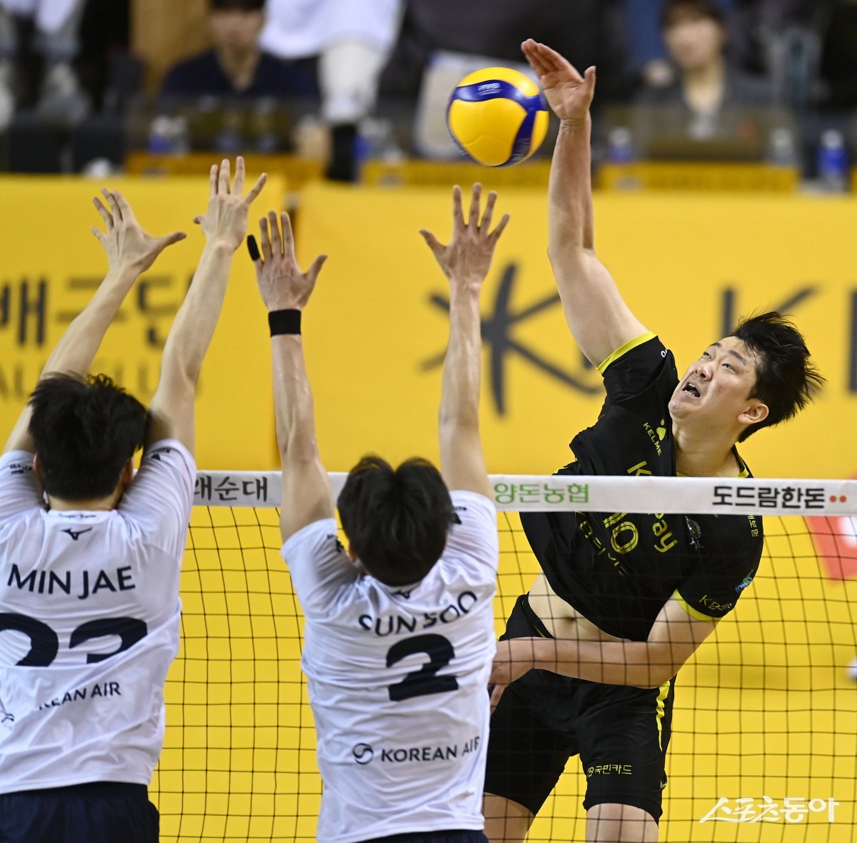 26일 의정부 경민대체육관에서 열린 ‘도드람 2024~2025 V-리그’ 남자부 플레이오프 1차전 KB손해보험과 대한항공 경기에서 KB손해보험 나경복이 대한항공의 블로킹 사이로 스파이크를 날리고 있다. 의정부 | 김종원 기자 won@donga.com