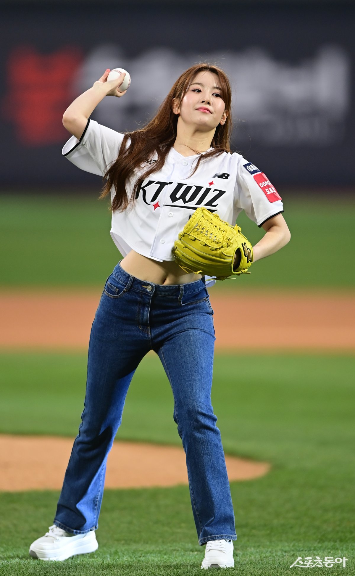 27일 수원KT위즈파크에서 열린 ‘2025 신한 SOL Bank KBO리그’ 두산 베어스와 KT 위즈의 경기에 앞서 미스트롯3 출연 가수 오유진이 시구를 하고 있다. 수원 | 주현희 기자 teth1147@donga.com