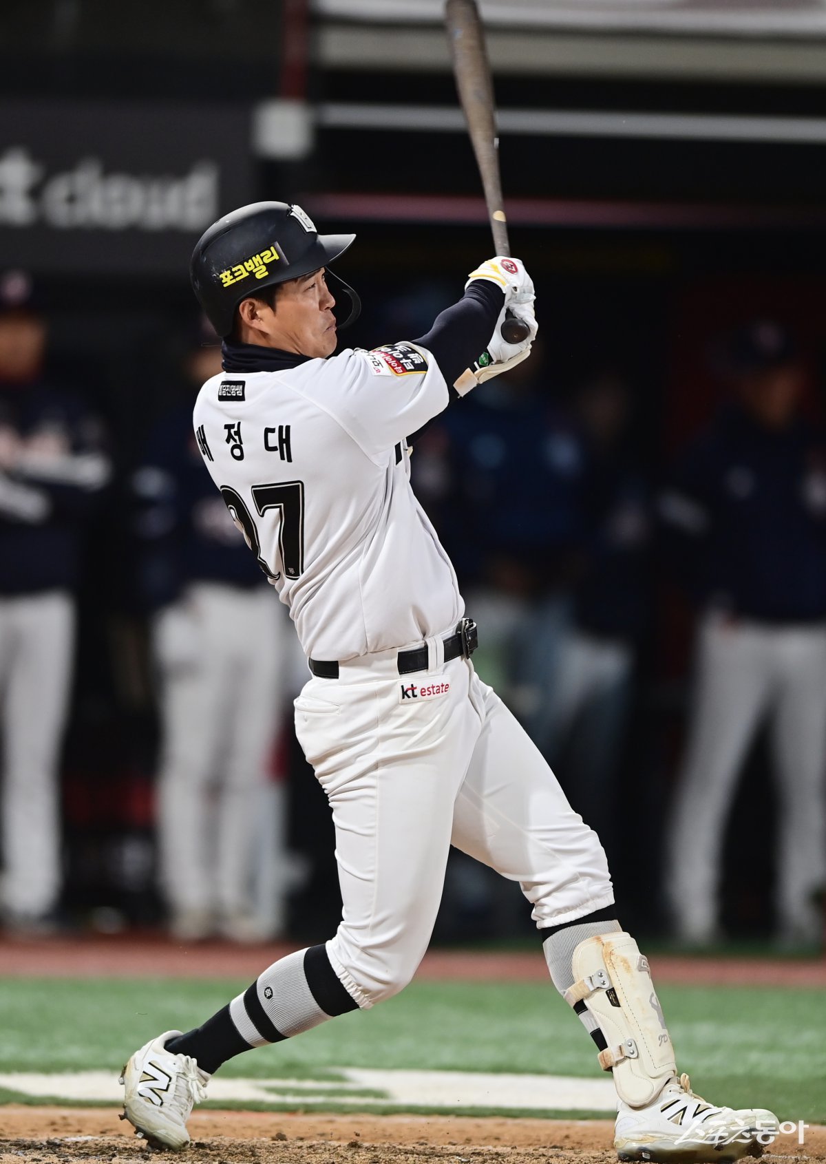 27일 수원KT위즈파크에서 열린 ‘2025 신한 SOL Bank KBO리그’ 두산 베어스와 KT 위즈의 경기에서 4회말 1사 KT 배정대가 좌월 솔로 홈런을 치고 있다. 수원 | 주현희 기자 teth1147@donga.com