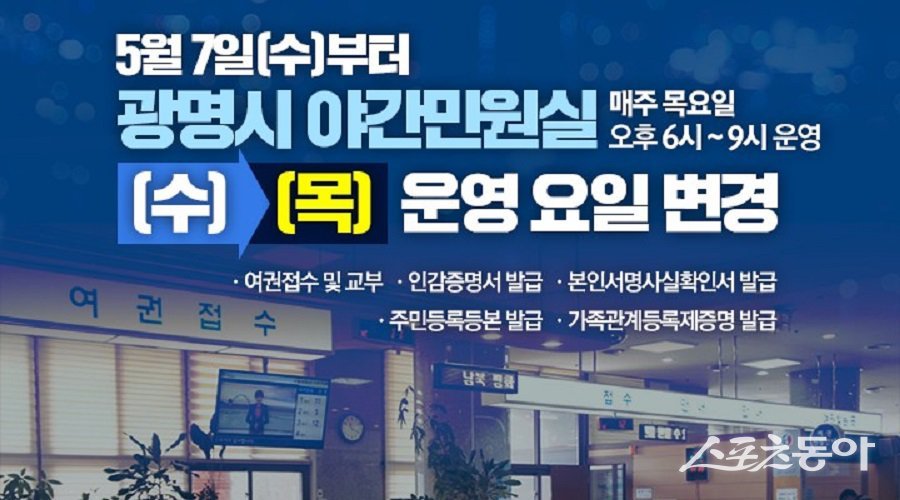 광명시(시장 박승원)는 오는 5월 7일부터 기존 매주 수요일에 운영하던 야간 민원실을 매주 목요일로 변경해 운영한다고 밝혔다.