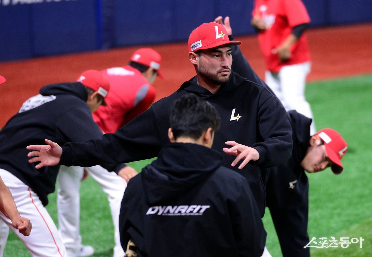 30일 서울 고척스카이돔에서 ‘2025 신한 SOL 뱅크 KBO리그’ 키움 히어로즈와 SSG 랜더스의 경기가 열린다. 경기 전 SSG 화이트가 훈련을 하고 있다. 고척 | 김민성 기자 marineboy@donga.com