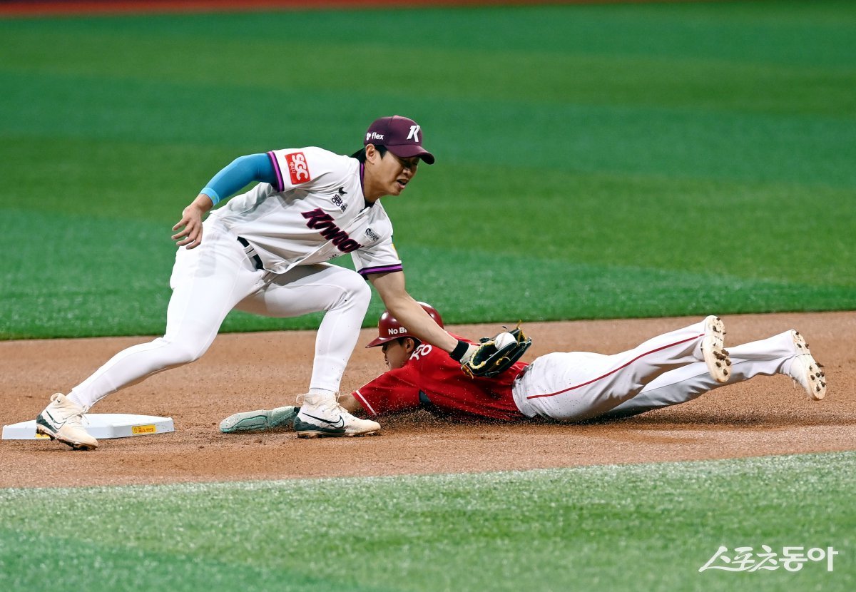 30일 서울 고척스카이돔에서 ‘2025 신한 SOL 뱅크 KBO리그’ 키움 히어로즈와 SSG 랜더스의 경기가 열렸다. 1회초 1사 1루에서 SSG 정준재가 2루 도루를 성공하고 있다. 고척 | 김민성 기자 marineboy@donga.com