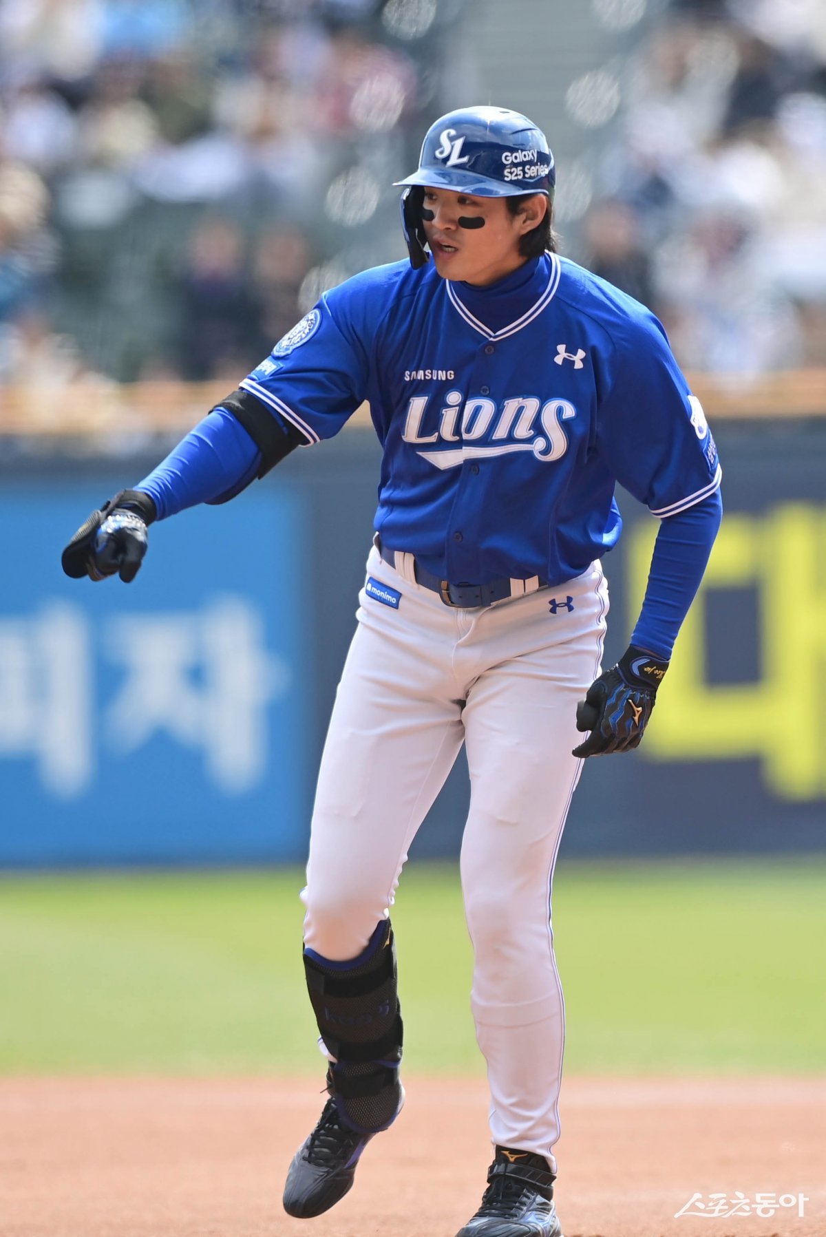 30일 서울 잠실야구장에서 열린 ‘2025 신한 SOL Bank KBO리그’ 삼성 라이온즈와 두산 베어스의 경기에서 1회초 무사 1, 3루 삼성 구자욱이 선제 1타점 좌전 적시타를 친 후 세리머니를 하고 있다. 잠실 | 주현희 기자 teth1147@donga.com