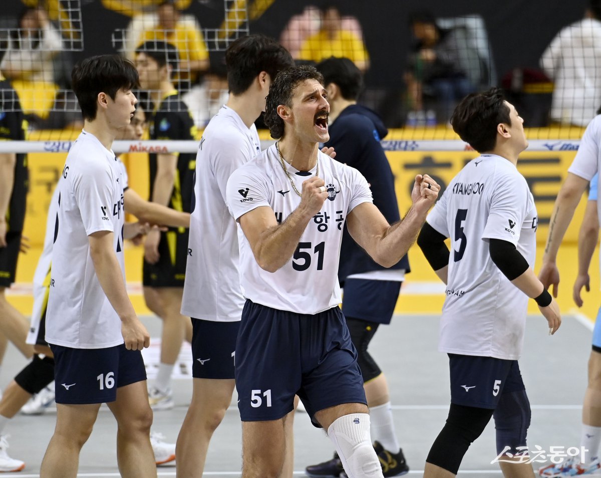 30일 의정부 경민대체육관에서 열린 ‘도드람 2024~2025 V-리그’ 남자부 플레이오프 3차전 KB손해보험과 대한항공 경기에서 대한항공이 세트스코어 3-0 승리를 거두며 챔피언결정전에 진출했다. 러셀이 환호하고 있다. 의정부 | 김종원 기자 won@donga.com