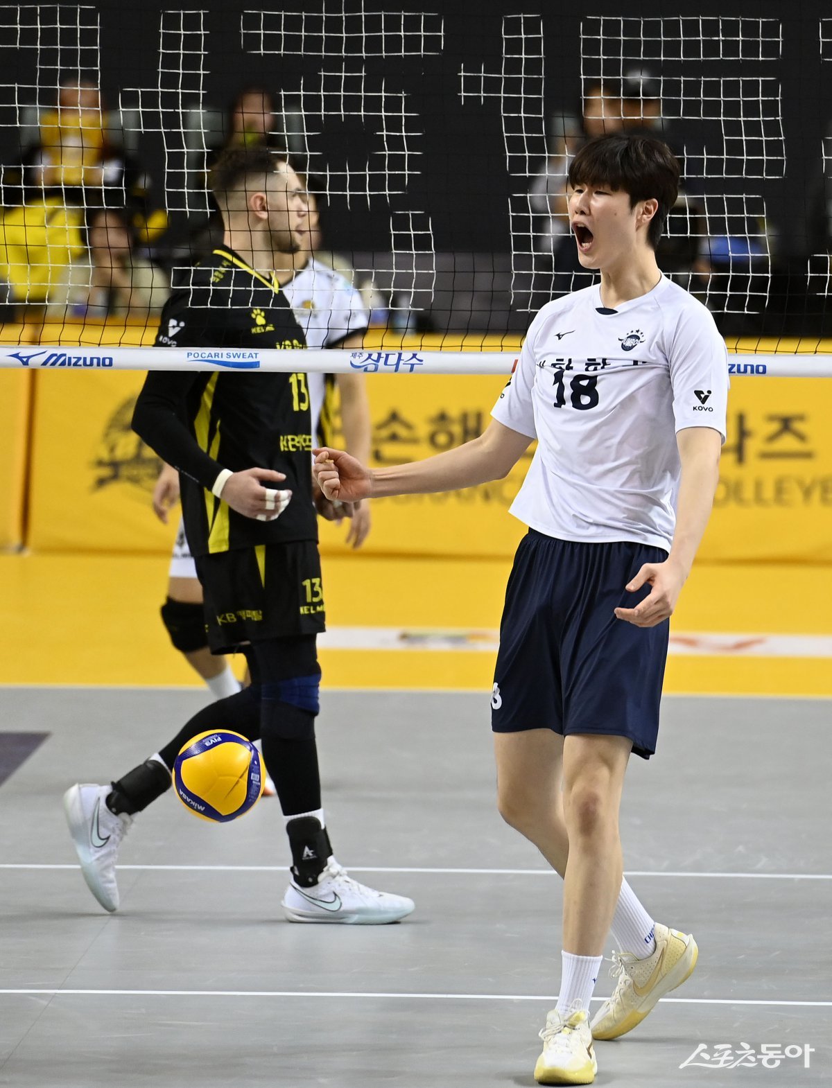 30일 의정부 경민대체육관에서 열린 ‘도드람 2024~2025 V-리그’ 남자부 플레이오프 3차전 KB손해보험과 대한항공 경기에서 대한항공 최준혁이 블로킹 득점에 성공한 후 기뻐하고 있다. 의정부 | 김종원 기자 won@donga.com