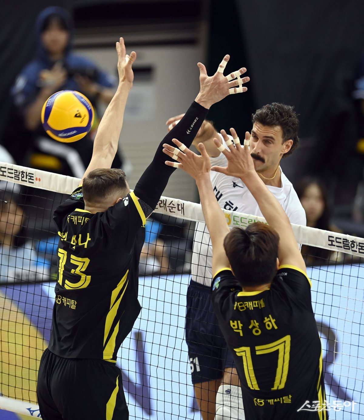 30일 의정부 경민대체육관에서 열린 ‘도드람 2024~2025 V-리그’ 남자부 플레이오프 3차전 KB손해보험과 대한항공 경기에서 대한항공 러셀이 KB손해보험의 블로킹 사이로 스파이크를 날리고 있다. 의정부 | 김종원 기자 won@donga.com