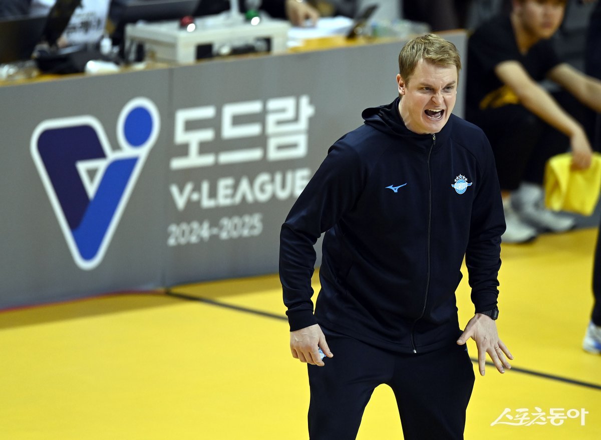 30일 의정부 경민대체육관에서 열린 ‘도드람 2024~2025 V-리그’ 남자부 플레이오프 3차전 KB손해보험과 대한항공 경기에서 대한항공 틸리카이넨 감독이 작전 지시를 하고 있다. 의정부 | 김종원 기자 won@donga.com