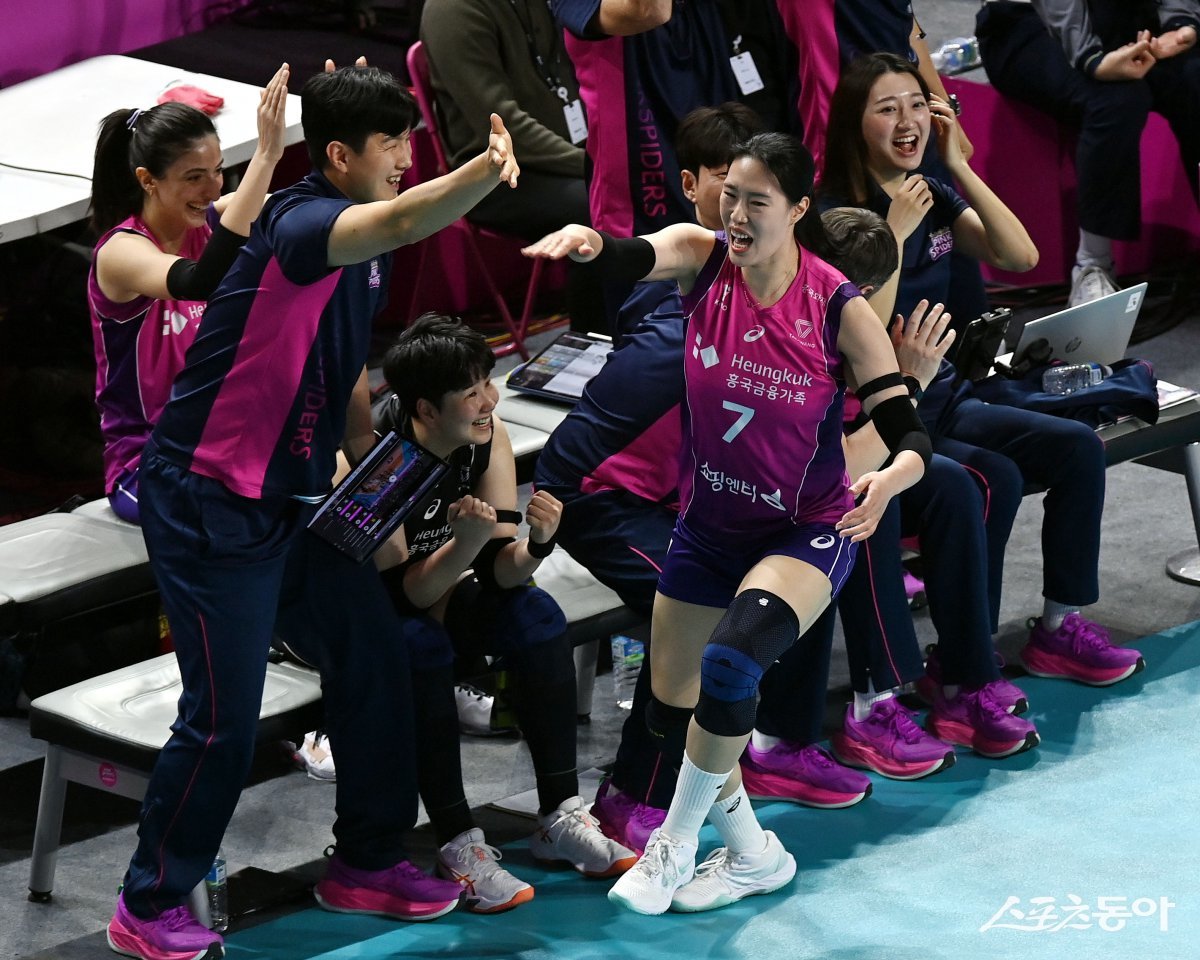 31일 인천 삼산월드체육관에서 ‘도드람 2024-2025 V리그’ 흥국생명과 정관장의 여자부 챔피언결정전 경기가 열렸다. 흥국생명 최은지가 서브 득점 후 환호하고 있다. 인천 | 김민성 기자 marineboy@donga.com