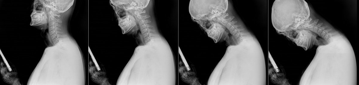 스마트폰을 이용할 때 목뼈와 척추의 모양을 찍은 X-레이. 이런 자세를 오래 하면 정상적이면 C자 모양을 해야할 목뾰가 일자목이나 거북목으로 변형되어 통증을 일으키게 된다 사진제공|바른세상병원