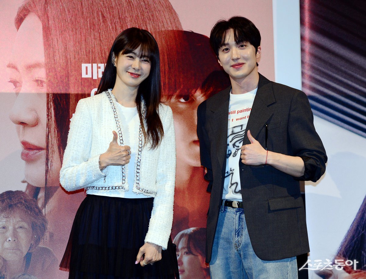 1일 서울 용산 CGV용산아이파크몰에서 열린 영화 ‘귀신들’ 언론 시사회에 참석한 이요원과 강찬희가 카메라를 향해 포즈를 취하고 있다. 김민성 기자 marineboy@donga.com