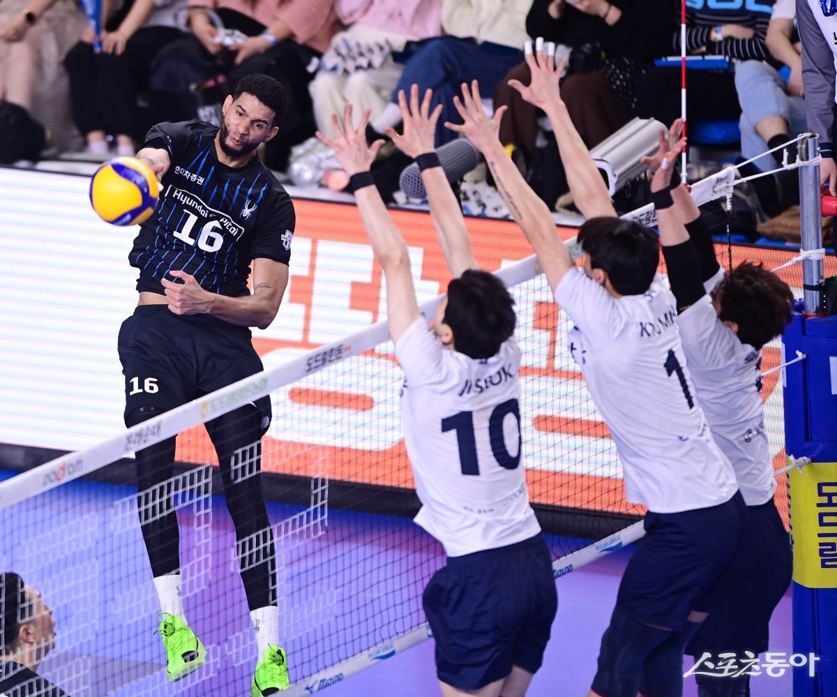 1일 천안종합운동장 유관순체육관에서 열린 ‘2024-2025 V리그 포스트시즌’ 남자부 챔피언결정전 1차전 현대캐피탈과 대한항공의 경기에서 현대캐피탈 레오가 대한항공 블로커 앞에서 스파이크를 하고 있다. 천안 | 주현희 기자 teth1147@donga.com