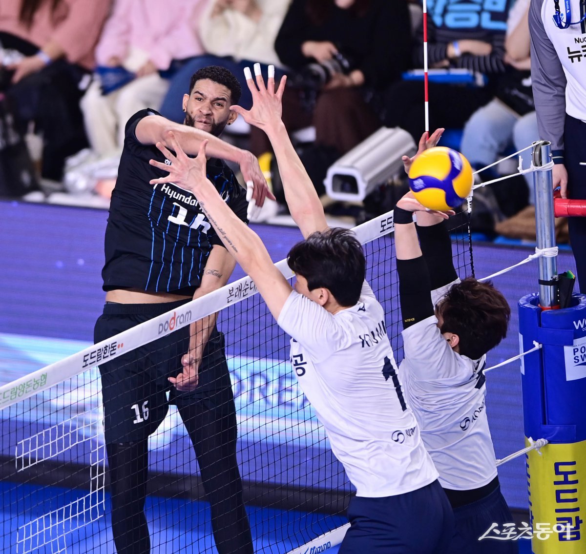 1일 천안종합운동장 유관순체육관에서 열린 ‘2024-2025 V리그 포스트시즌’ 남자부 챔피언결정전 1차전 현대캐피탈과 대한항공의 경기에서 현대캐피탈 레오가 대한항공 블로커 앞에서 스파이크를 하고 있다. 천안 | 주현희 기자 teth1147@donga.com
