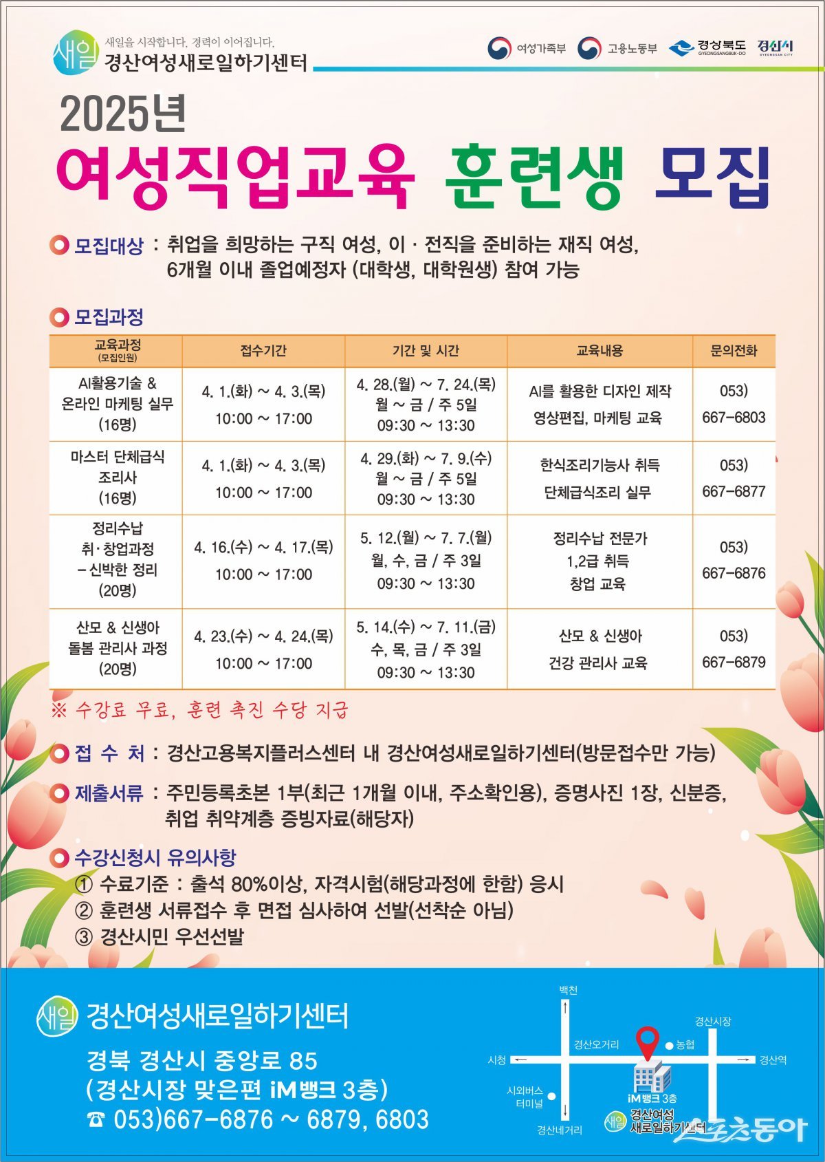 경산여성새로일하기센터(센터장 채은주)에서는 취·창업을 희망하는 여성 및 재직 여성을 위한 2025년 여성 직업교육훈련과정을 개설하여 총 72명의 수강생을 모집한다.특히, 올해는 훈련생에게 부담되는 예치금이 없어지고 훈련생의 책임성 있는 참여에 대한 긍적적 유인 효과를 줄 수 있도록, 직업교육훈련에 20일 60시간 기준 출석률 80%를 충족 시, 참여촉진수당 10만원(최대 3개월)과 훈련 종료 후 사후 관리 참여 기준 충족 시, 훈련사후관리촉진수당 10만원을 지원 받을 수 있다.