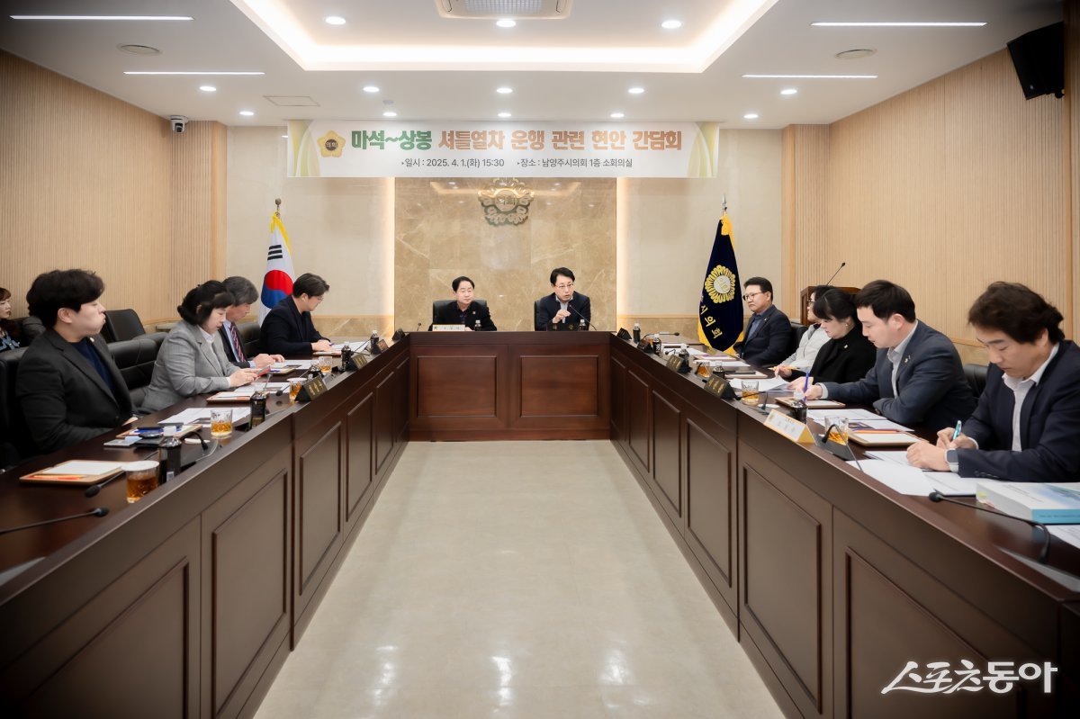 남양주시의회 도시교통위원회(위원장 박경원)는 1일 남양주시의회 소회의실에서 마석-상봉 셔틀열차 추진과 관련 간담회를 가졌다.