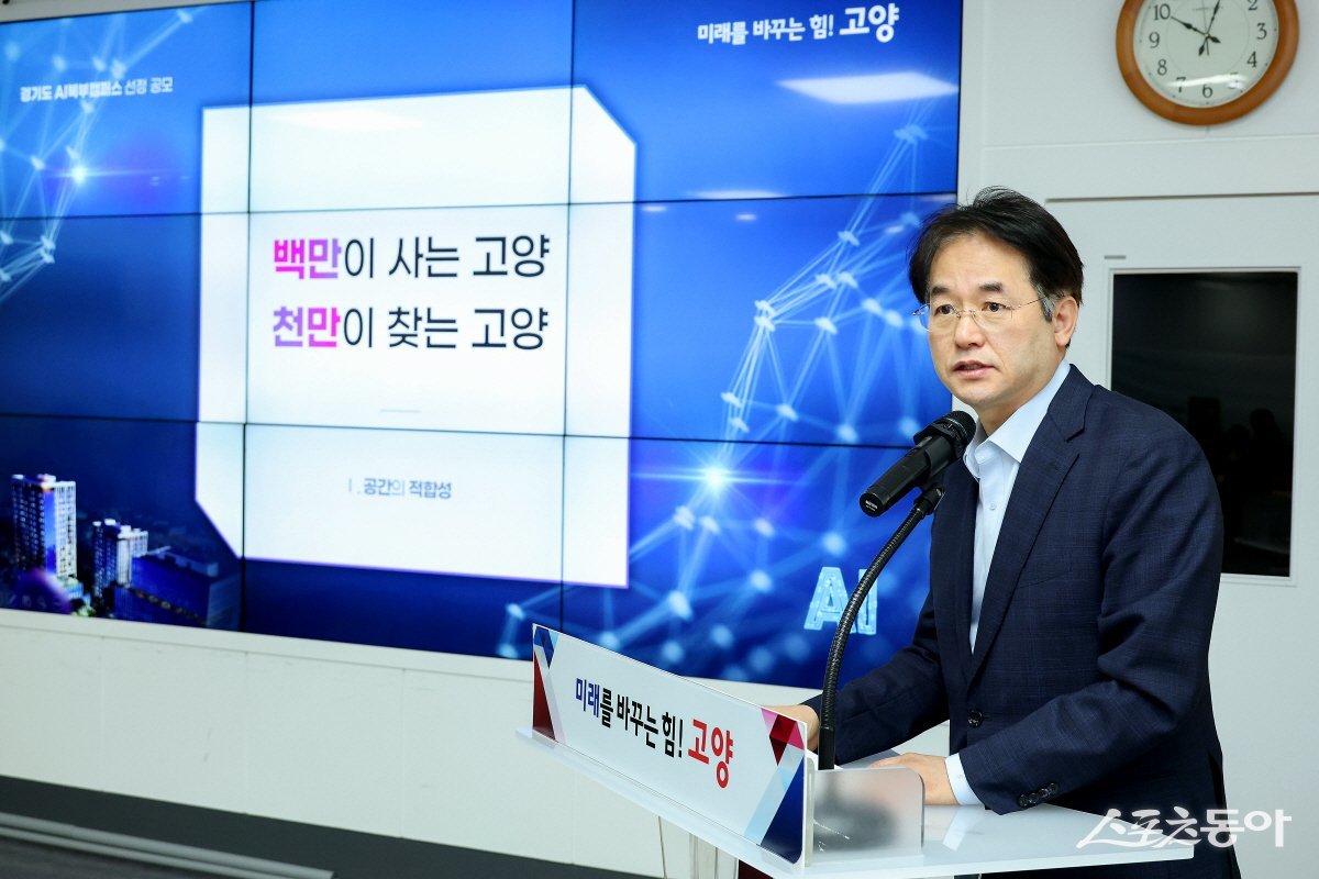 경기 AI 캠퍼스’현장평가 프레젠테이션 중인 이동환 고양특례시장. 사진제공ㅣ고양시
