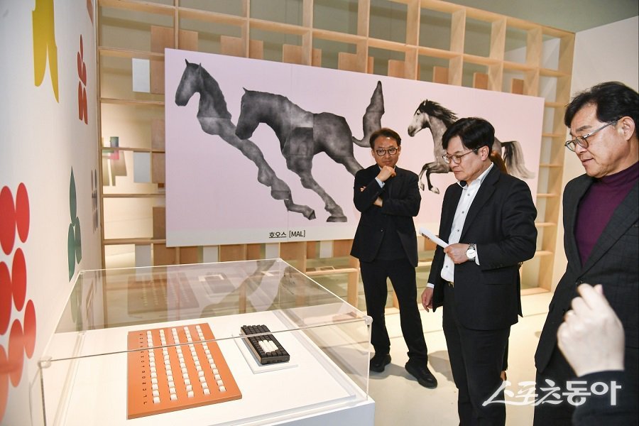 김포시, 국립한글박물관과 김포문화재단이 함께 준비한 작품을 감상하고 있는 김병수 김포시장. 사진제공|김포시청