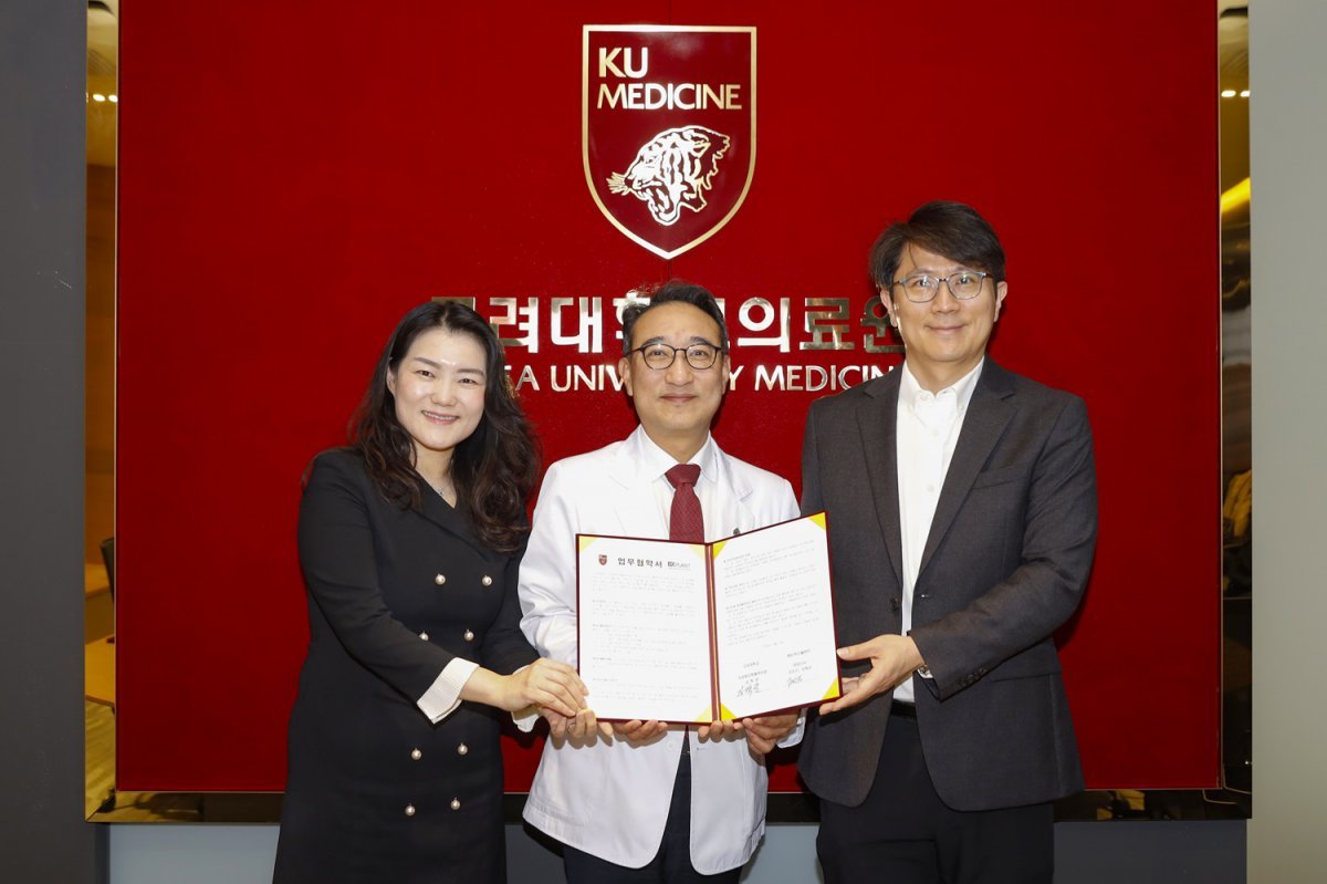 고려대의료원 산학협력단과 )비엑스플랜트가 바이오헬스케어 분야 연구고도화를 위한 업무협약을 체결식. 김학준 의료원산학협력단장(가운데)과 비엑스플랜트 조민근 대표(오른쪽), 김희선 대표이사(왼쪽)가 협약서에 서명 후 기념 촬영을 하고 있다 사진제공|고려대의료원
