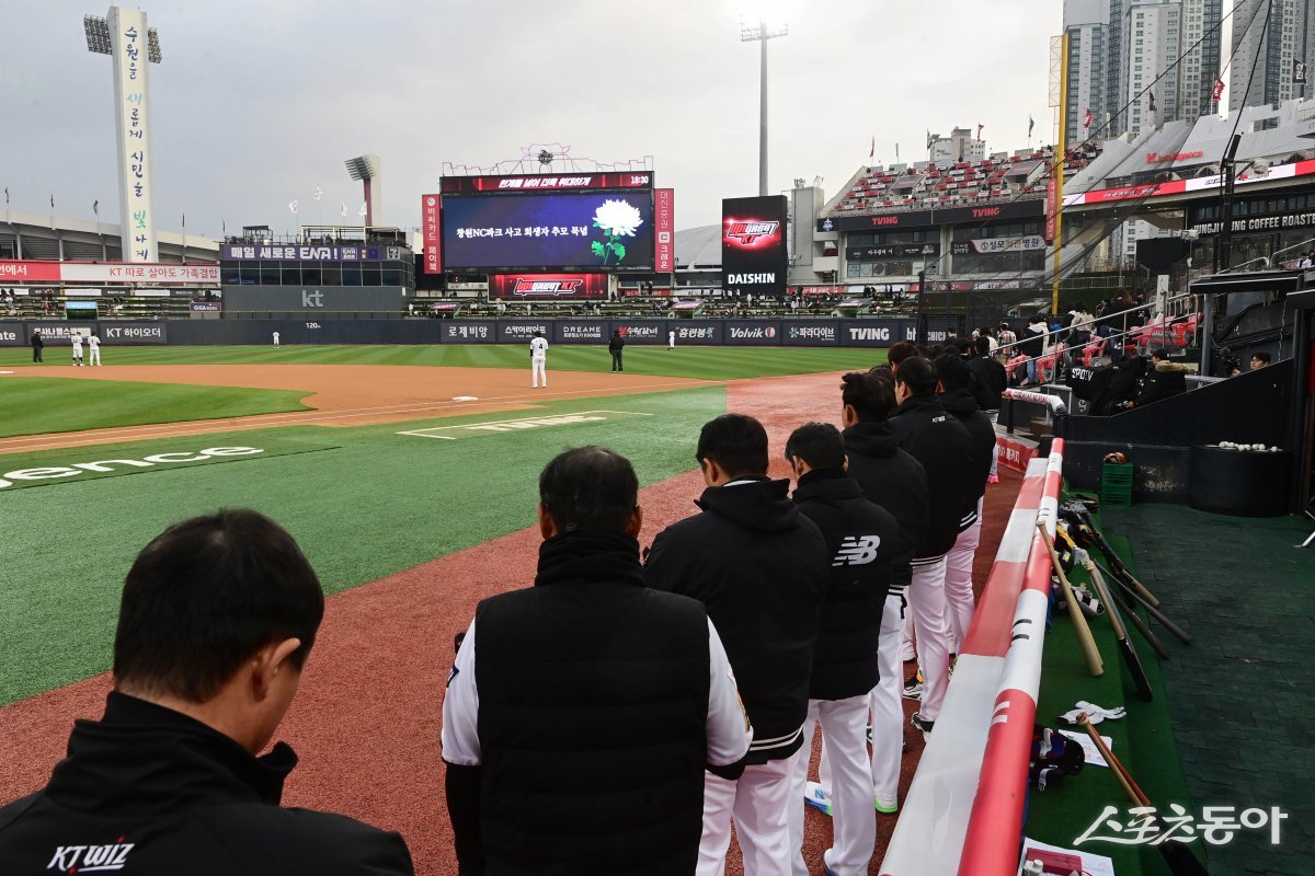 2일 수원KT위즈파크에서 열린 ‘2025 신한 SOL Bank KBO리그’ LG 트윈스와 KT 위즈의 경기에 앞서 KT 선수단이 창원NC파크 사고 희생자 추모 묵념을 하고 있다. 수원 | 주현희 기자 teth1147@donga.com