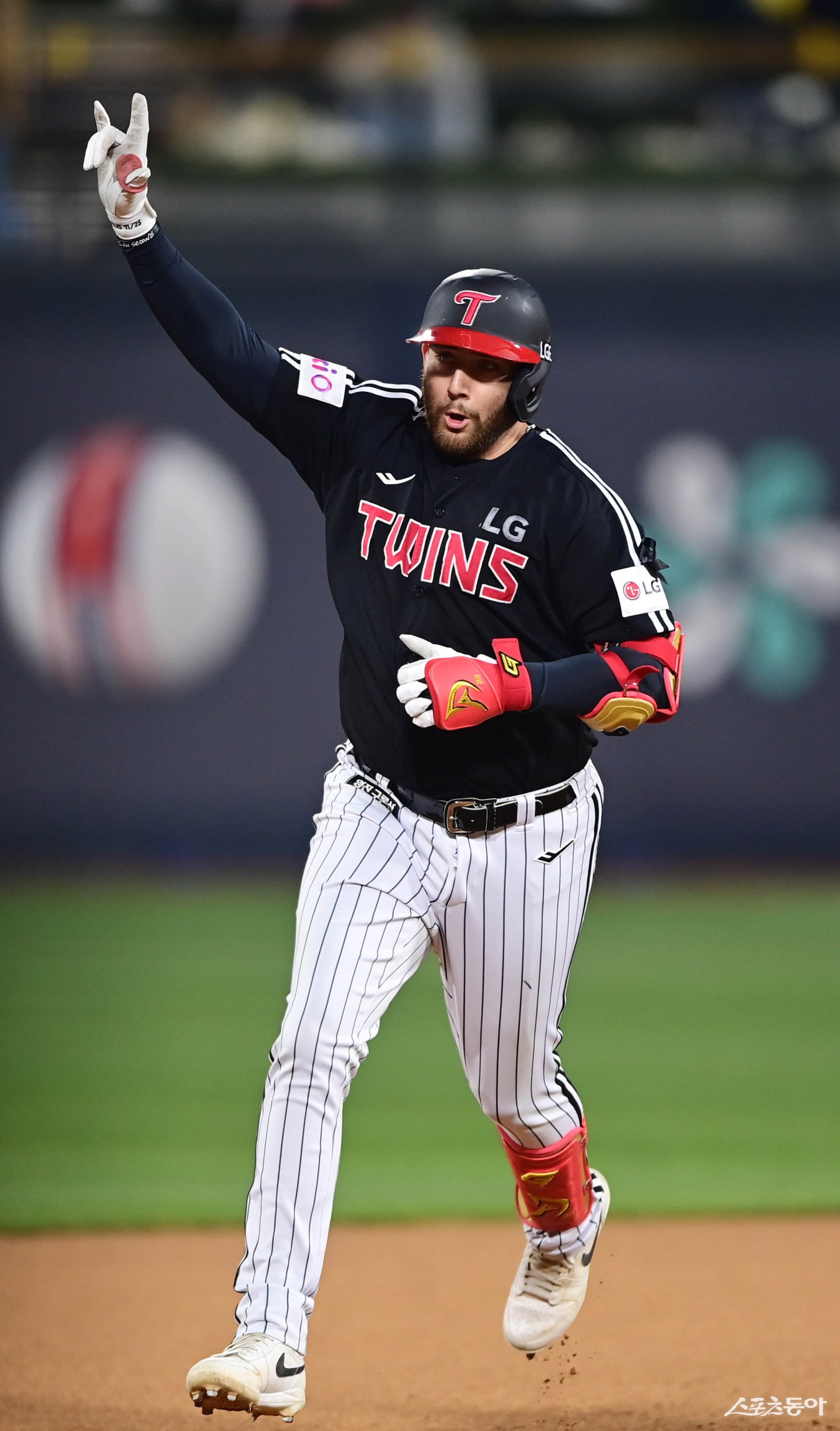 2일 수원KT위즈파크에서 열린 ‘2025 신한 SOL Bank KBO리그’ LG 트윈스와 KT 위즈의 경기에서 3회초 2사 LG 오스틴이 중월 솔로 홈런을 친 후 세리머니를 하고 있다. 수원 | 주현희 기자 teth1147@donga.com