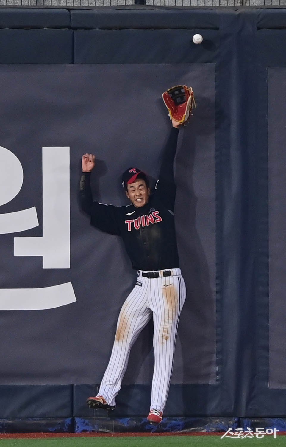 2일 수원KT위즈파크에서 열린 ‘2025 신한 SOL Bank KBO리그’ LG 트윈스와 KT 위즈의 경기에서 1회말 무사 1루 KT의 안타 때 LG 송찬의가 볼을 향해 글러브를 뻗고 있다. 수원 | 주현희 기자 teth1147@donga.com