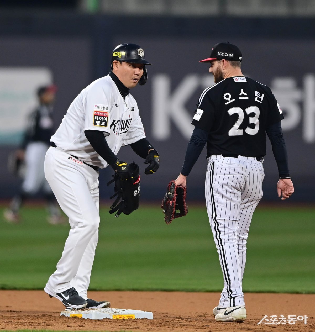 2일 수원KT위즈파크에서 열린 ‘2025 신한 SOL Bank KBO리그’ LG 트윈스와 KT 위즈의 경기에서 1회말 1사 1, 2루 KT 장성우가 역전 2타점 좌전 2루타를 친 후 보호 장비를 벗고 있다. 수원 | 주현희 기자 teth1147@donga.com