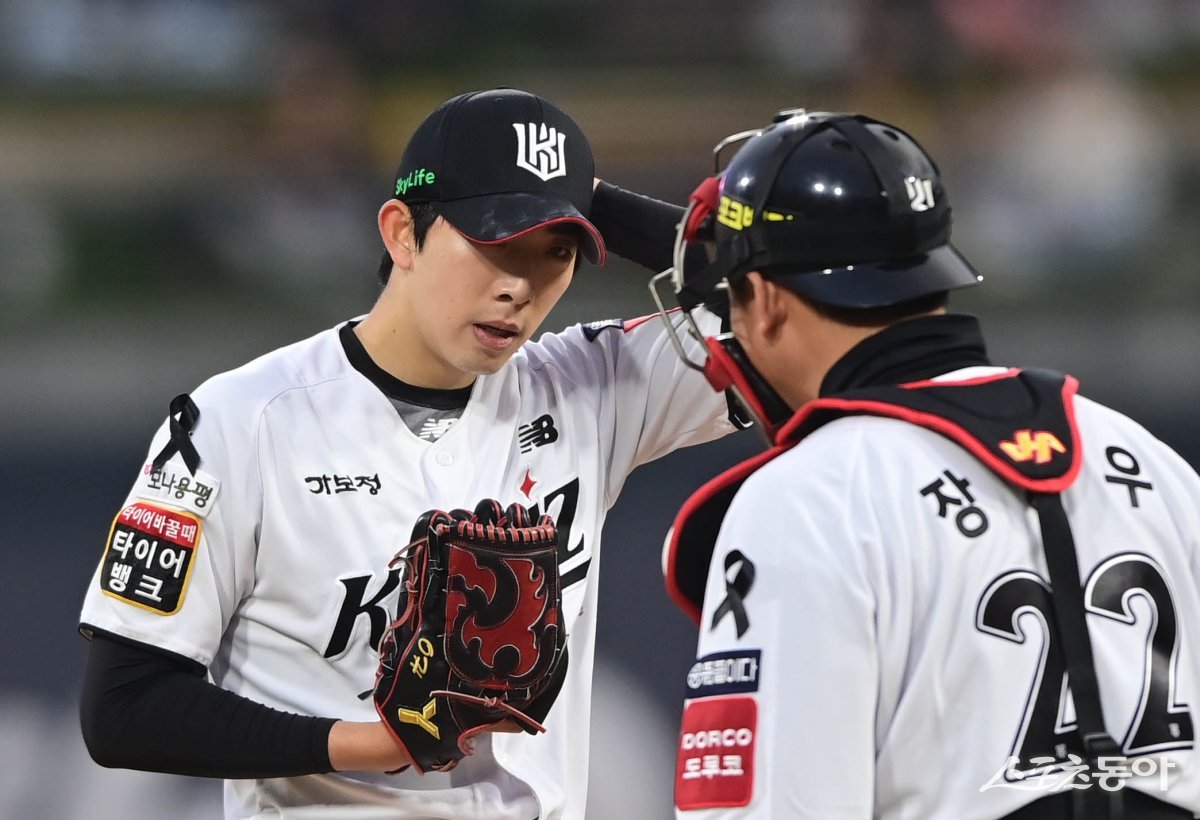 2일 수원KT위즈파크에서 열린 ‘2025 신한 SOL Bank KBO리그’ LG 트윈스와 KT 위즈의 경기에서 KT 선발 투수 오원석이 창원NC파크 사고 희생자 추모 근조 리본을 달고 있다. 수원 | 주현희 기자 teth1147@donga.com