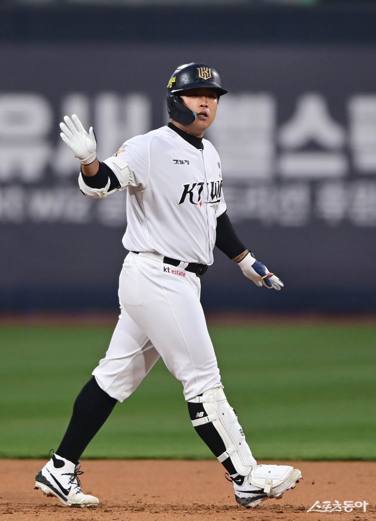 2일 수원KT위즈파크에서 열린 ‘2025 신한 SOL Bank KBO리그’ LG 트윈스와 KT 위즈의 경기에서 1회말 무사 1루 KT 강백호가 동점 1타점 좌전 2루타를 친 후 세리머니를 하고 있다. 수원 | 주현희 기자 teth1147@donga.com