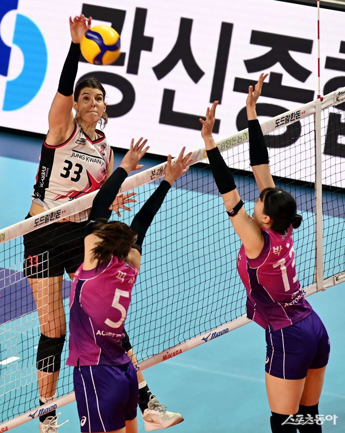 2일 인천 삼산월드체육관에서 ‘도드람 2024-2025 V리그’ 흥국생명과 정관장의 여자부 챔피언 결정전 경기가 열렸다. 정관장 부키리치가 흥국생명 블로커를 피해 스파이크를 날리고 있다. 인천 | 김민성 기자 marineboy@donga.com
