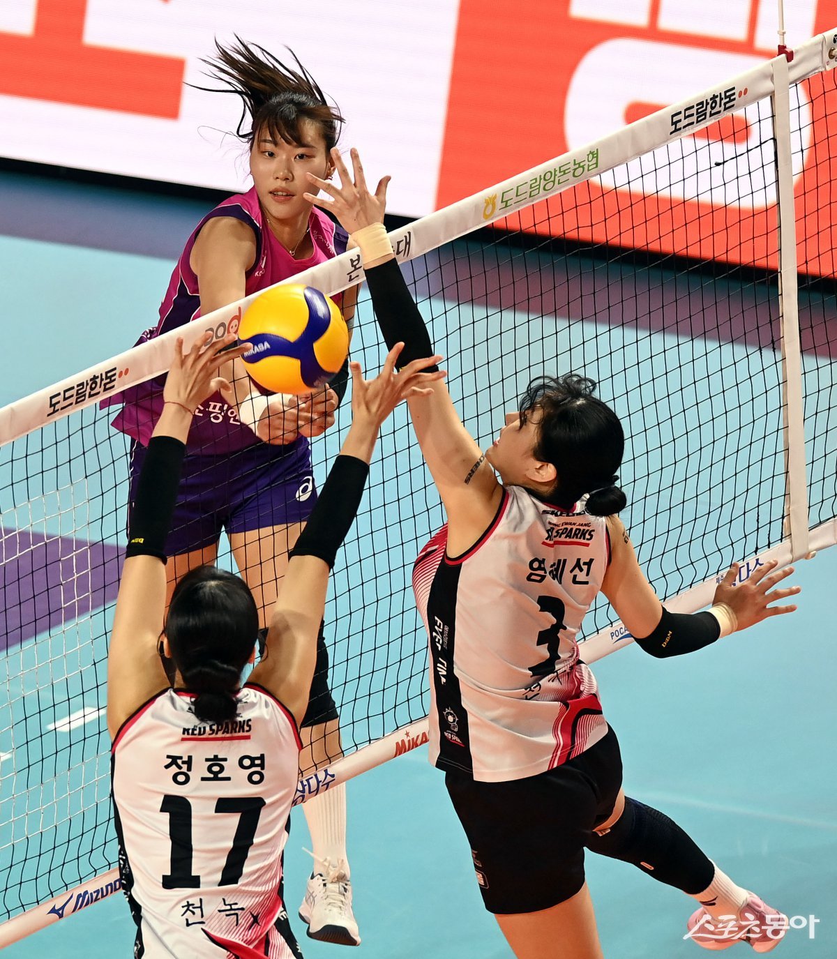 2일 인천 삼산월드체육관에서 ‘도드람 2024-2025 V리그’ 흥국생명과 정관장의 여자부 챔피언 결정전 경기가 열렸다. 흥국생명 정윤주가 정관장 블로커를 피해 스파이크를 날리고 있다. 인천 | 김민성 기자 marineboy@donga.com