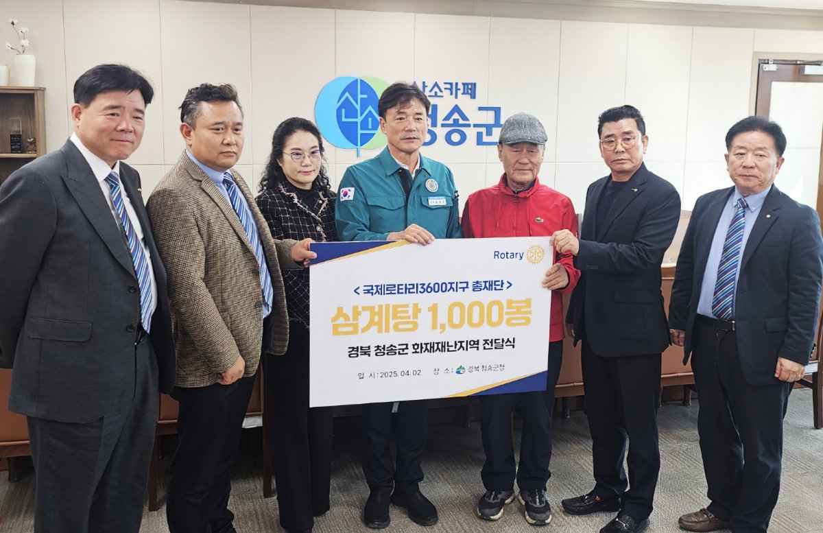 ‘국제로타리 3600 지구’ 총재단은 최근 대규모 화재로 큰 피해를 입은 경북 청송군을 찾아 성금 1000만 원과 삼계탕 1000마리를 전달했다.
