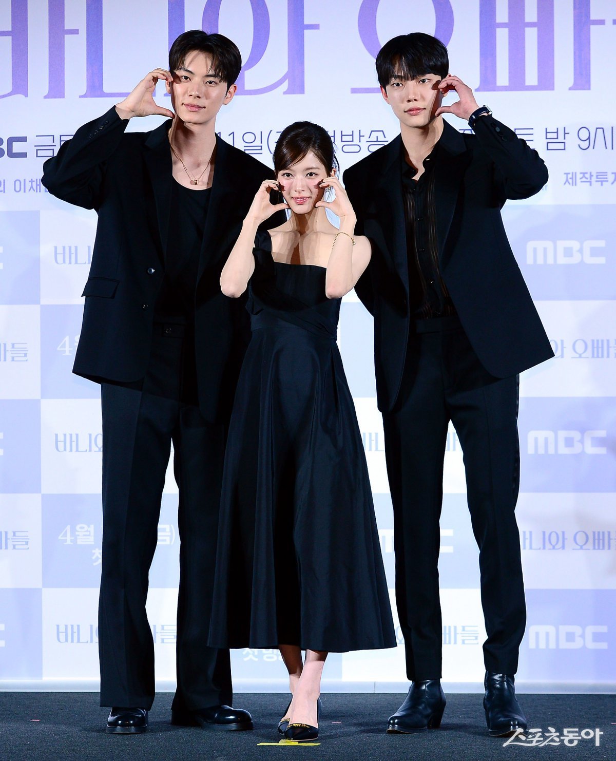3일 서울 용산구 CGV 용산아이파크몰에서 열린 MBC 새 금토드라마 ‘바니와 오빠들’ 제작발표회에 참석한 이채민, 노정의, 조준영이 카메라를 향해 포즈를 취하고 있다. 김민성 기자 marineboy@donga.com