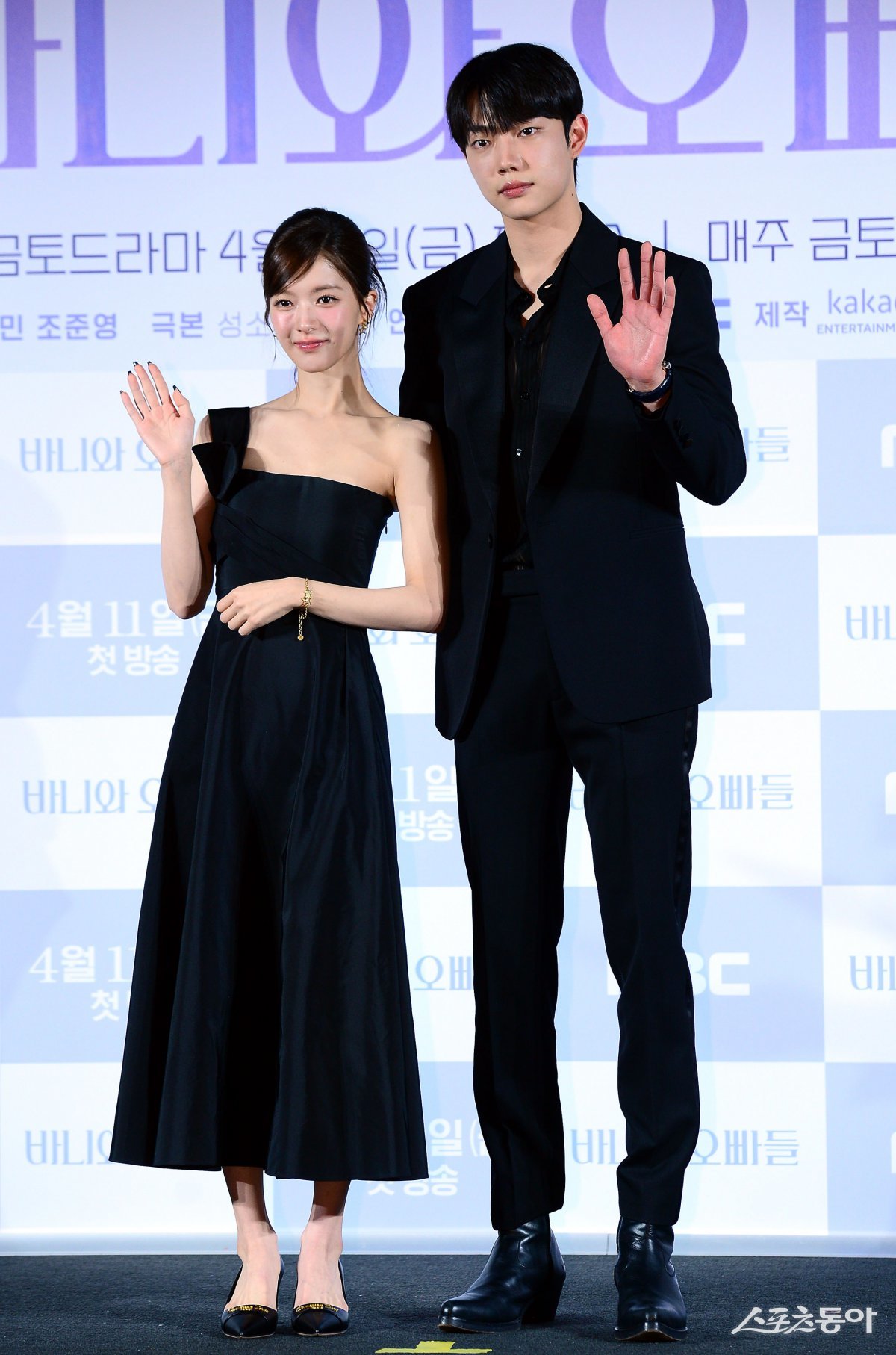 3일 서울 용산구 CGV 용산아이파크몰에서 열린 MBC 새 금토드라마 ‘바니와 오빠들’ 제작발표회에 참석한 노정의와 조준영이 카메라를 향해 포즈를 취하고 있다. 김민성 기자 marineboy@donga.com