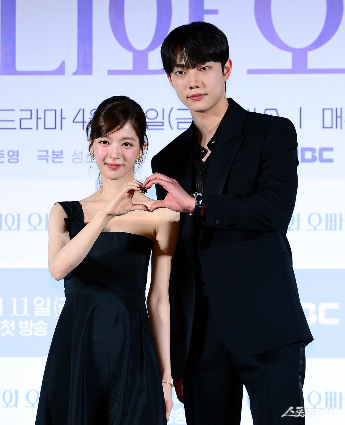 3일 서울 용산구 CGV 용산아이파크몰에서 열린 MBC 새 금토드라마 ‘바니와 오빠들’ 제작발표회에 참석한 노정의와 조준영이 카메라를 향해 포즈를 취하고 있다. 김민성 기자 marineboy@donga.com