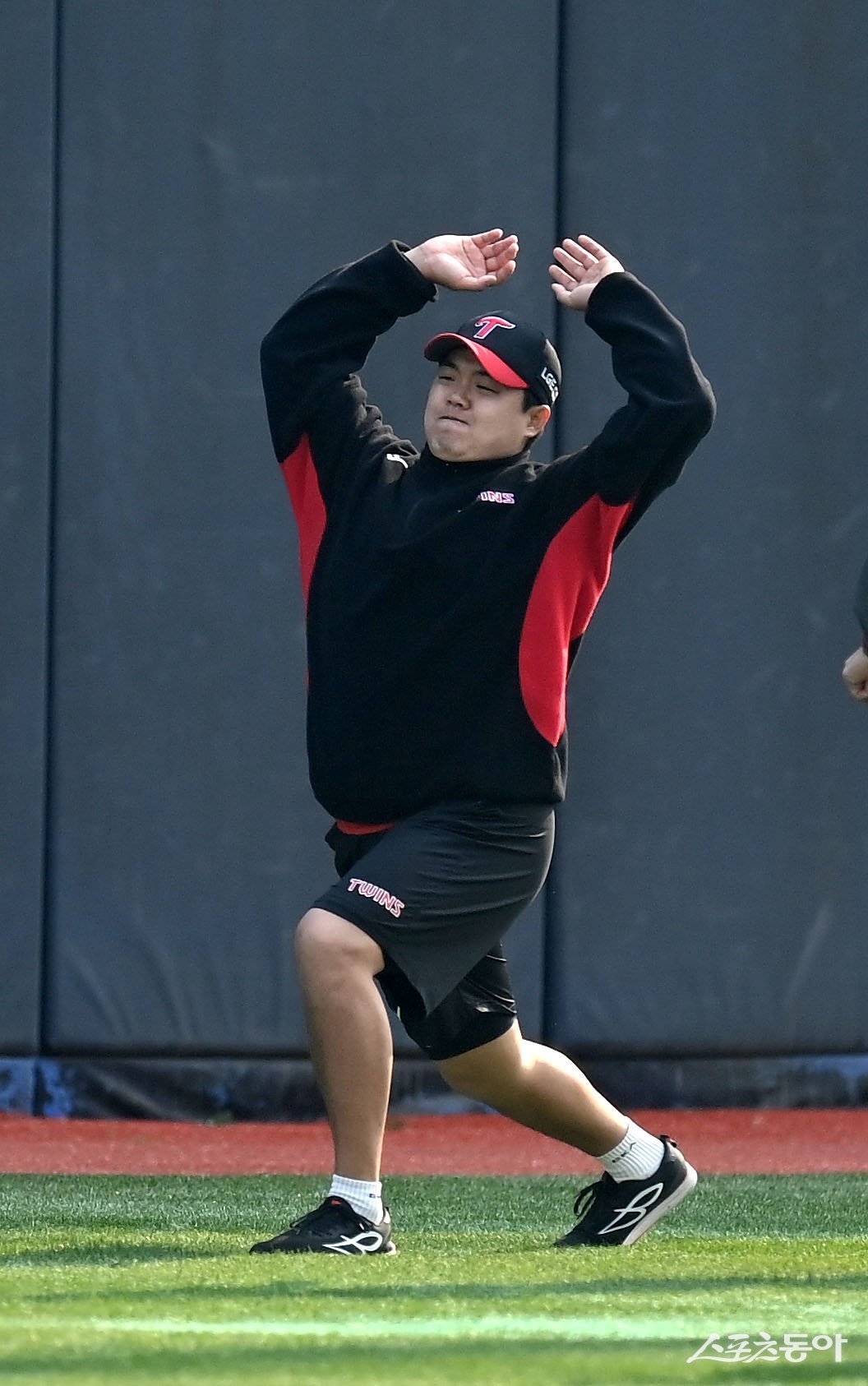 3일 수원KT위즈파크에서 ‘2025 신한은행 SOL뱅크 KBO리그’ LG 트윈스와 KT 위즈 경기가 열린다. 1군에 합류한 LG 장현식이 몸을 풀고 있다. 수원|김종원 기자 won@donga.com